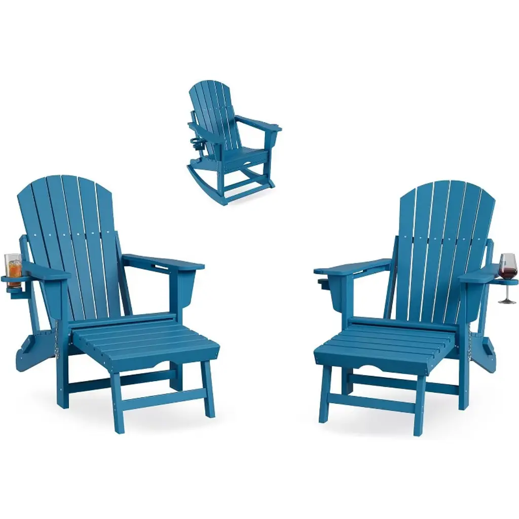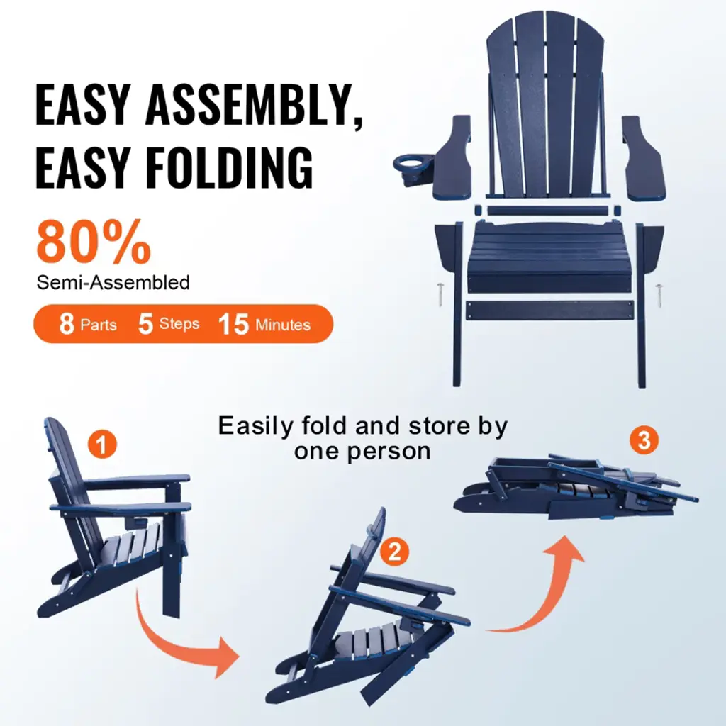 Feature: Foldable Design: This plastic Adirondack chair folds for easy storage and transport, fitting neatly into garages, storage rooms, and more. Note: Color may slightly vary in different lighting. Easy Assembly: With precise pre-drilled holes (tolerance ≤0.019in), assembly takes just 15 minutes using a power screwdriver. Includes 8 parts and 2 accessory packs with clear instructions. Heat and Water Resistant: The folding adirondack chairs are made from high-quality HDPE plastic, it resists heat, water, and various weather conditions without warping, cracking, or rotting. Perfect for patios, gardens, pools, beaches, and porches. Spacious Comfort: Measures 31.5×29.7×36.0 inches, with a wider seat and curved backrest. The 105° tilt angle offers deep seating for effective spine relaxation and fatigue relief. Supports up to 400 lbs, suitable for adults and larger individuals. Thoughtful Details: The wide armrests provide natural arm support, and the built-in cup holder accommodates most outdoor cups for convenience. For easy cleaning, simply wipe with a cloth to keep it looking like new, making it perfect for long-term outdoor use. Package Content 2 x Backrests 2 x Seats 2 x Armrests 2 x Cup Holders 2 x Accessory Boxes 2 x User Manuals