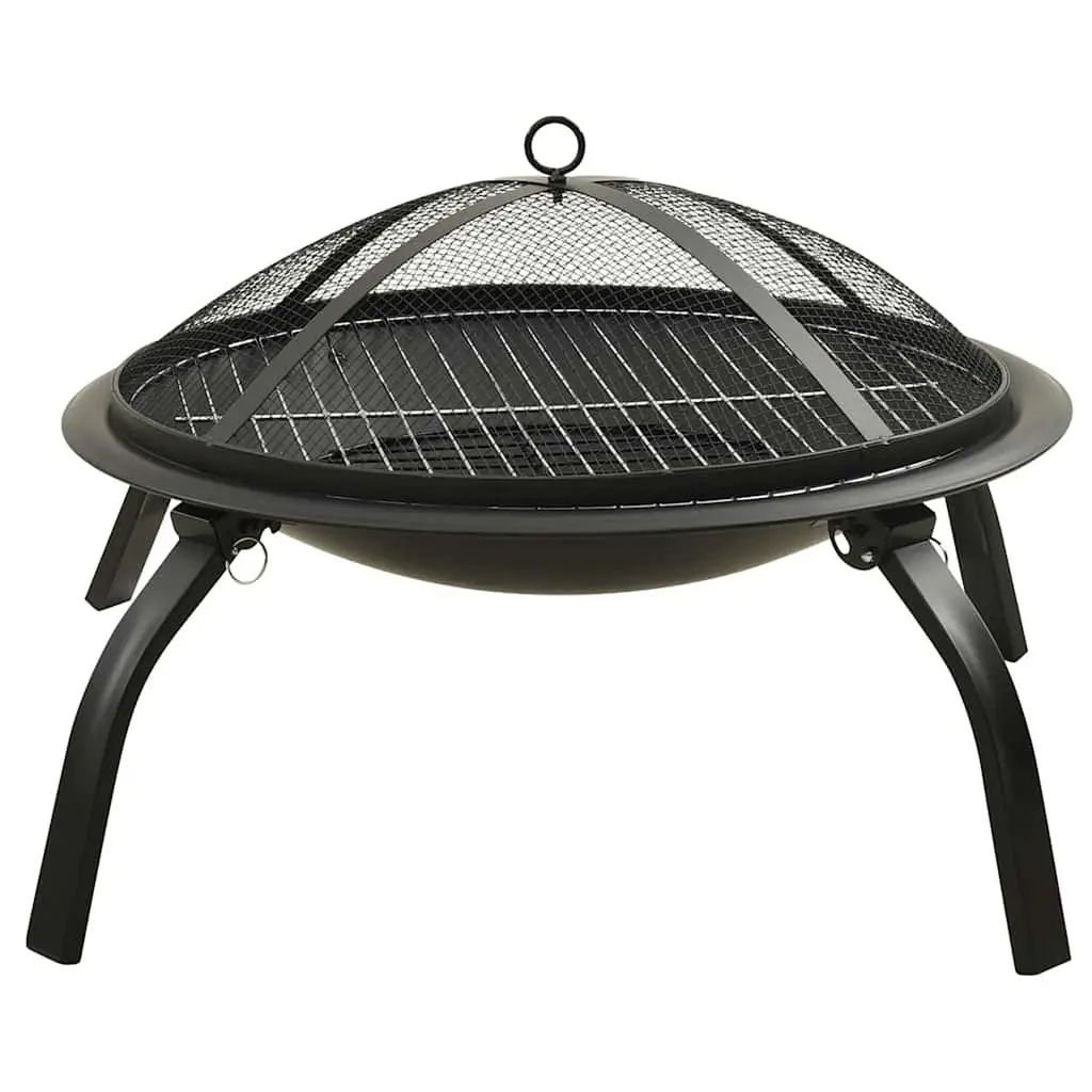 A quick and easy way to keep you warm and also whip up a feast outdoors! Bring this 2-in-1 fire pit to your home right now!The fire pit, made of steel, is excellent in absorbing and radiating heat. This fireplace features a large bowl, allowing for a large fire for you and your family to enjoy for hours. The mesh allows you to watch the burning fire, and encloses the fire for safety as well as preventing sparks and debris from flying out. Additionally, there is a convenient ring in the mesh cover so that you can carry it easily. The poker can be used for both removing the mesh cover and rearranging the logs. With the included cooking grid, you can even have a barbecue. What's more, the legs can be folded for easy transportation.Important notes: It can only be used outdoors. To avoid injuries and burns, do not touch the product when there is still burning wood inside or shortly after it.