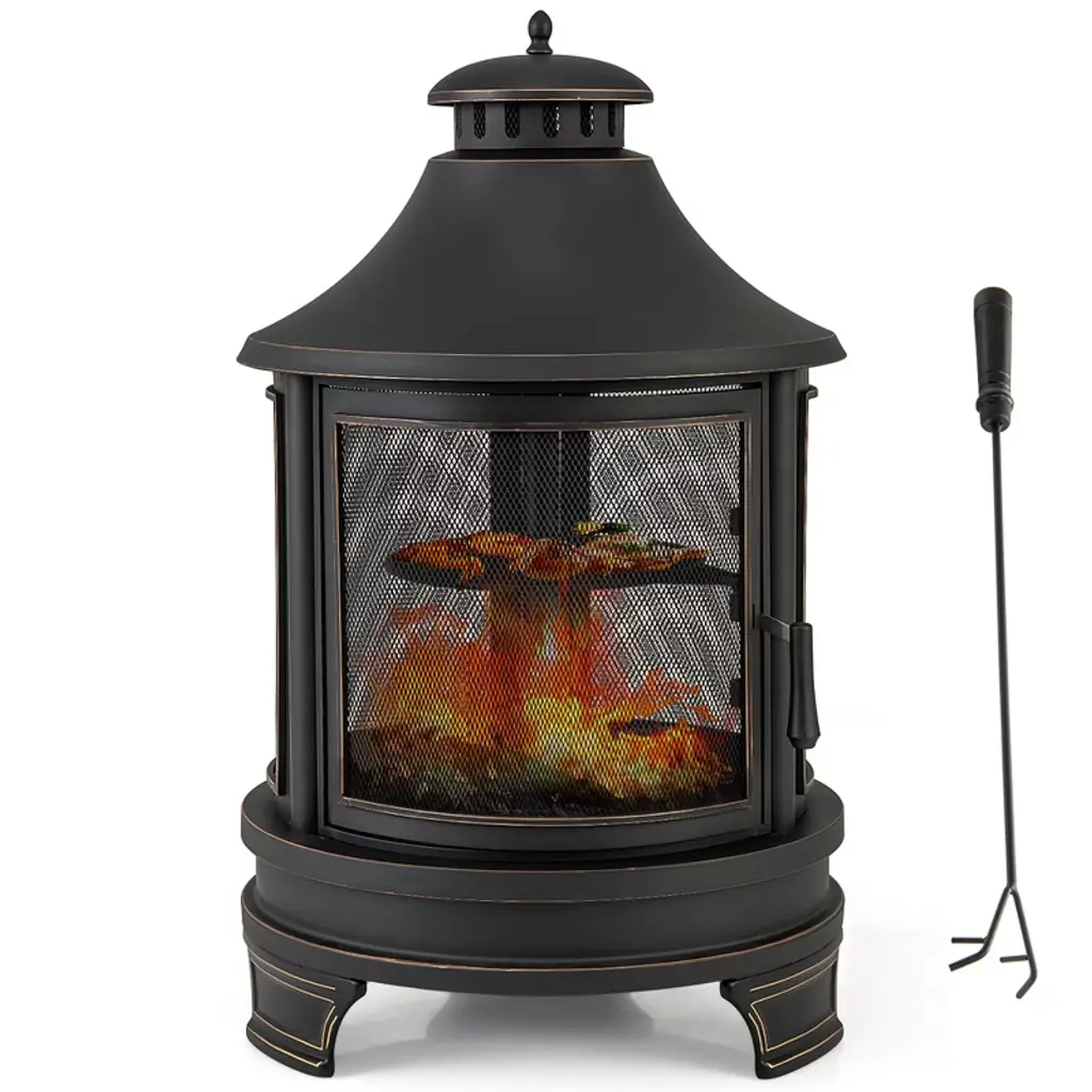 Create a warm inviting glow with this chimenea fire pit. The antique finish and smoke funnel with a Maya design gives this fireplace a contemporary look. Decorate your lawn and garden while adding a warm and cozy vintage charm. Use it to burn a fire or simply as a decorative accent.