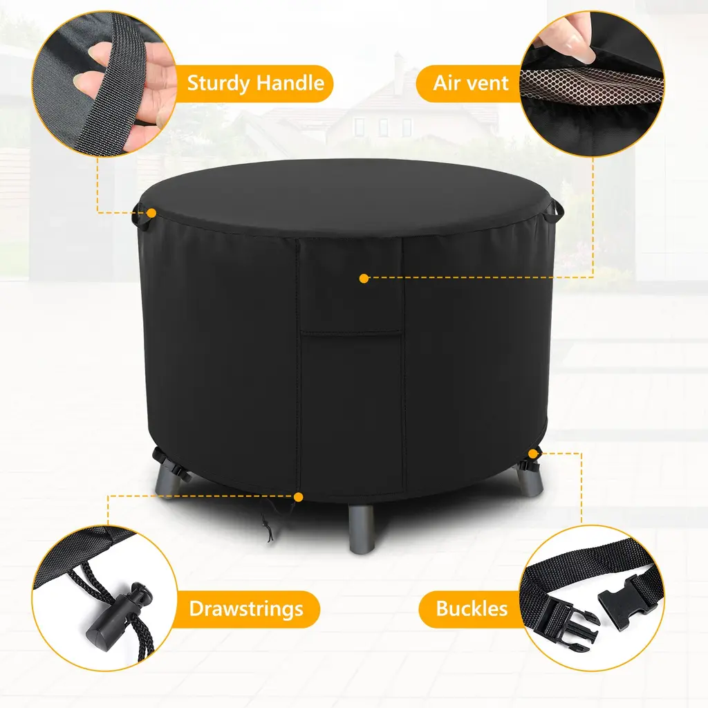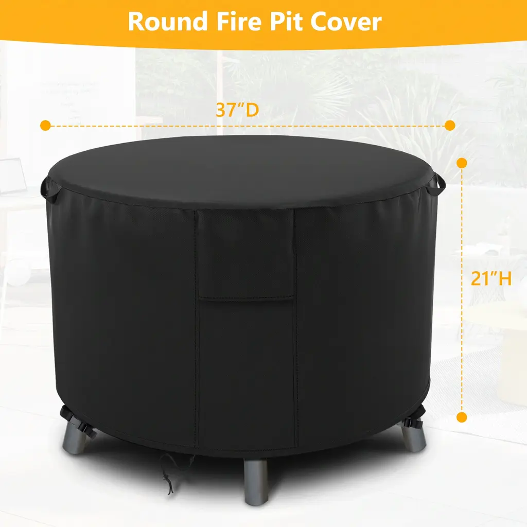 Protect your outdoor fire pit year-round. Crafted from durable 420D Oxford polyester fabric and featuring a waterproof PU coating, this cover ensures your fire pit stays shielded from rain, sunlight, dust, and snow. Its dustproof and UV-resistant properties keep your fire pit clean and well-preserved, no matter the weather. The adjustable Velcro straps and elastic hem rope provide a secure fit, even during windy conditions. Invest in this Super Heavy-duty Fire Pit Cover for worry-free enjoyment and to maintain your fire pit in top-notch condition.Features:Unmatched Wind ResistanceOur outdoor fire pitcover boasts an adjustable drawstring, ensuring an impeccable fit even in strong winds. Rest assured, your cover will stay put!Enhanced Air CirculationThoughtful design includes well-structured air vents that promote optimal airflow. These vents effectively reduce condensation, preventing moisture buildup and rust.Secure Drawstring SystemTighten the drawstring to snugly fit the cover around your fire pit, providing unbeatable wind protection. This feature is especially handy during inclement weather.Versatile Outdoor ProtectionAvailable in various sizes our cover fits not only most round fire pits but also propane fire pits, outdoor wood-burning fireplaces, and outdoor furniture of similar dimensions. (Please measure before purchase!)Hassle-Free MaintenanceCleaning is a breeze - simply rinse with water or wipe with a damp cloth and air dry. Our included compact bag makes storage space-efficient and hassle-free.