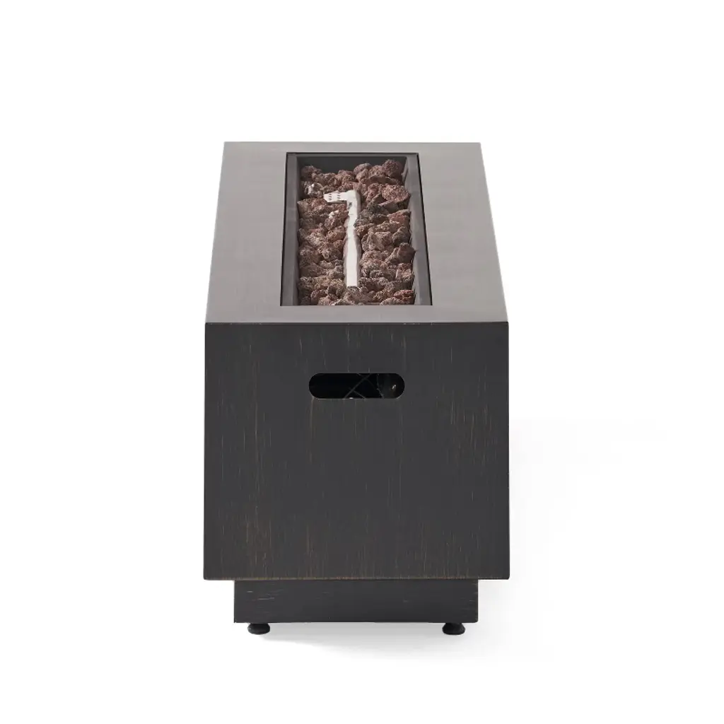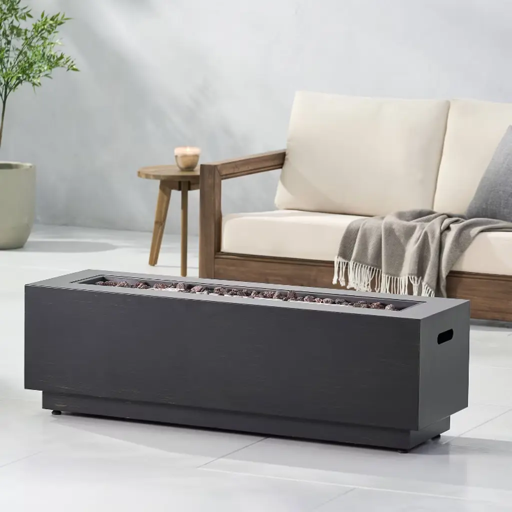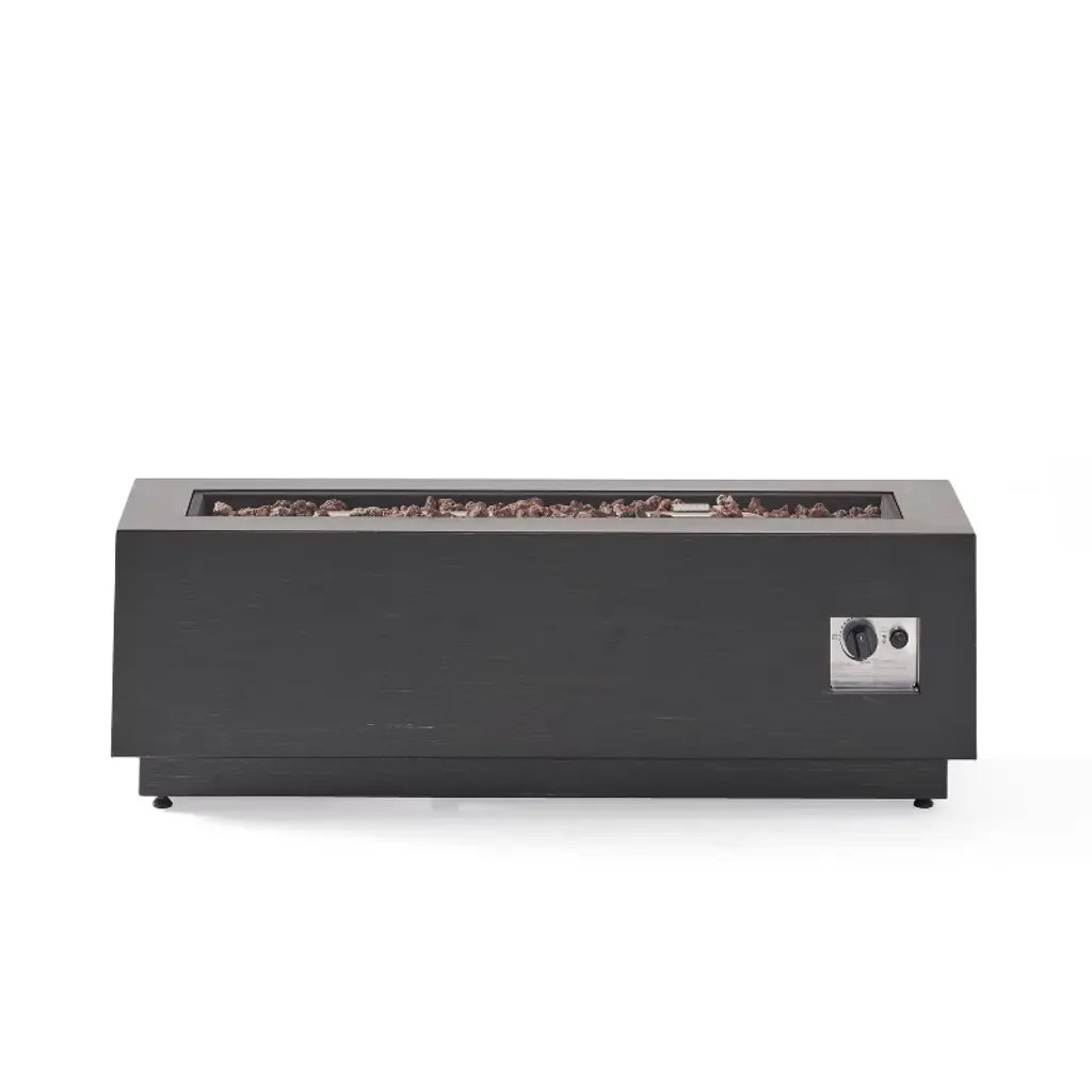 Gather your friends and family and enjoy the delightful warmth around a fire. With a rectangular structure of powder-coated iron, this 50,000 BTU propane gas fire pit not only offers an incredible upgrade in style but is also perfect for parties due to its easy seating arrangement. From intimate conversations around a cozy fire to stargazing on cool summer nights, our fire pit will have no trouble gathering everyone together for hours of quality time. Please note that tank holder is NOT included.MODERN DESIGN: With clean, precise lines, our fire pit is the ideal modern accessory for your interior space. Finished with a chic metal frame, this piece not only offers a chic, minimalistic look but also provides incredible structure.IRON FIRE PIT WITH FINISH: Constructed of powder-coated iron, the frame of this fire pit is made to be incredibly durable, ensuring that this piece will hold up under use. The frame is finished with a complementing color, making this an understated yet chic addition to your home.50,000 BTU: Featuring a rectangular shape and a BTU of 50,000, our fire pit allows easy seating arrangement for you and your guests, providing light and warmth all around during those chilly evenings. Please note that this fire pit is propane gas only.DIMENSIONS: Choose an accessory that is the perfect size for you and your furniture. This fire pit is 48.00" W x 15.00" D x 15.00" H. You will love how much your space can transform with the simple addition of this charming fire pit.NO ASSEMBLY REQUIRED: No assembly is required for this fire pit. Simply place the lava rocks in the pit without covering the burner, and then plug in your standard-size propane tank and enjoy your fire pit. Please note that tank holder is NOT included.