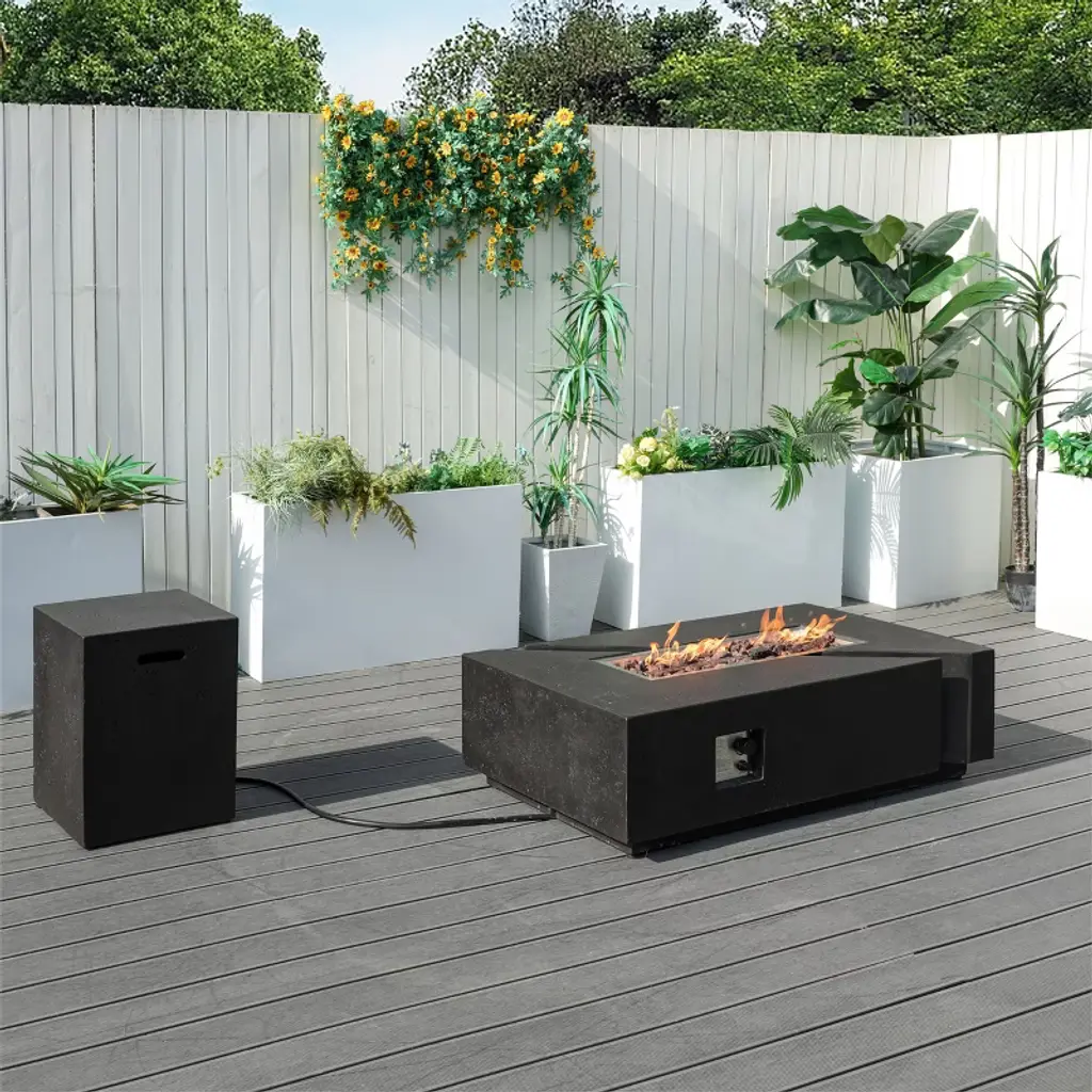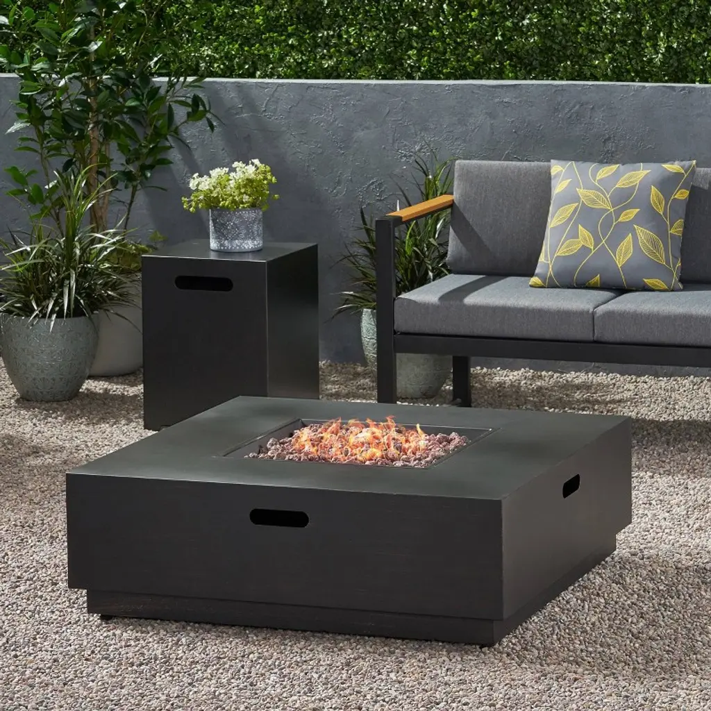 Fashion your outdoor space with a stunning modern centerpiece that will transform the way you experience your summer evenings. With a square structure of sleek, powder-coated iron, this piece not only offers an incredible upgrade in style but is also perfect for parties due to its easy seating arrangement and matching tank holder. From intimate conversations around a cozy fire to stargazing on cool summer nights, our wonderful fire pit will have no trouble gathering everyone together for hours of quality time. IRON FIRE PIT WITH FINISH: The fire pit is designed to be both stylish and provide light and warmth. Made from iron with a rust-resistant coating for a durable build that will last multiple seasons with proper care. This is complemented with an outstanding finish for a sleek, modern look. SQUARE FIREPIT: Featuring a square shape, our fire pit allows easy seating arrangement for you and your guests, providing light and warmth all around during those chilly evenings. TANK HOLDER: This fire pit comes with a matching tank holder to keep your propane tank inconspicuous. This is also made of iron so you can arrange this piece however you please and your set will always look classy. DIMENSIONS: Choose an accessory that is the perfect size for you and your furniture. This fire pit is 40.00” W x 40.00” D x 13.50” H and the tank holder is 15.25” W x 15.25” D x 19.75” H. You will love how much your space can transform with the simple addition of this charming fire pit. NO ASSEMBLY REQUIRED: No assembly is required for this fire pit. Simply place the lava rocks in the pit without covering the burner, and then plug in your standard size propane tank and enjoy your fire pit.