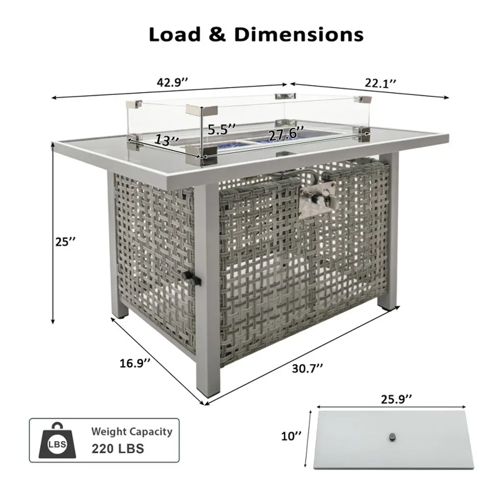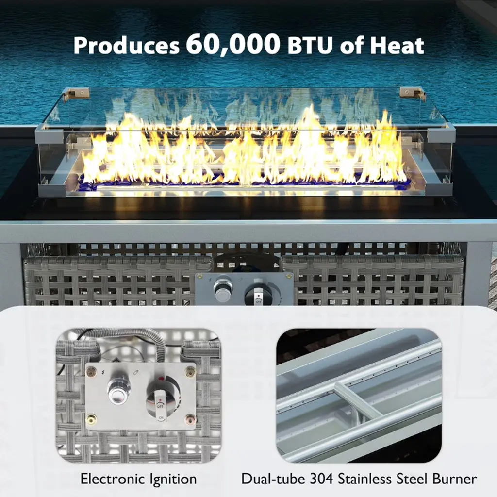 This 43" propane gas fire pit table is designed to bring warmth and ambiance to your outdoor space. The fire pit features all-weather black tempered glass with an open basket-wave patterned wicker, enhancing its natural texture and complementing the flame. Decorated with blue glass stones, the fire pit top sparkles with a soft glow, creating an enchanting visual effect. It includes a wind guard, lava glass, a lid, and assembled connected hoses. The dual-tube stainless steel burner provides a powerful 60,000 BTU output, ensuring ample warmth for gatherings of 8-10 people. The fire pit has CSA certification for safe usage and is crafted with a 100% steel frame and hand-woven resin wicker rated at 1000 UV hours. Assembly is easy with clear instructions and all necessary accessories included.