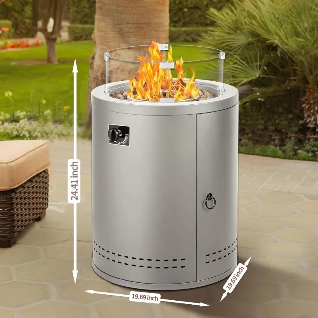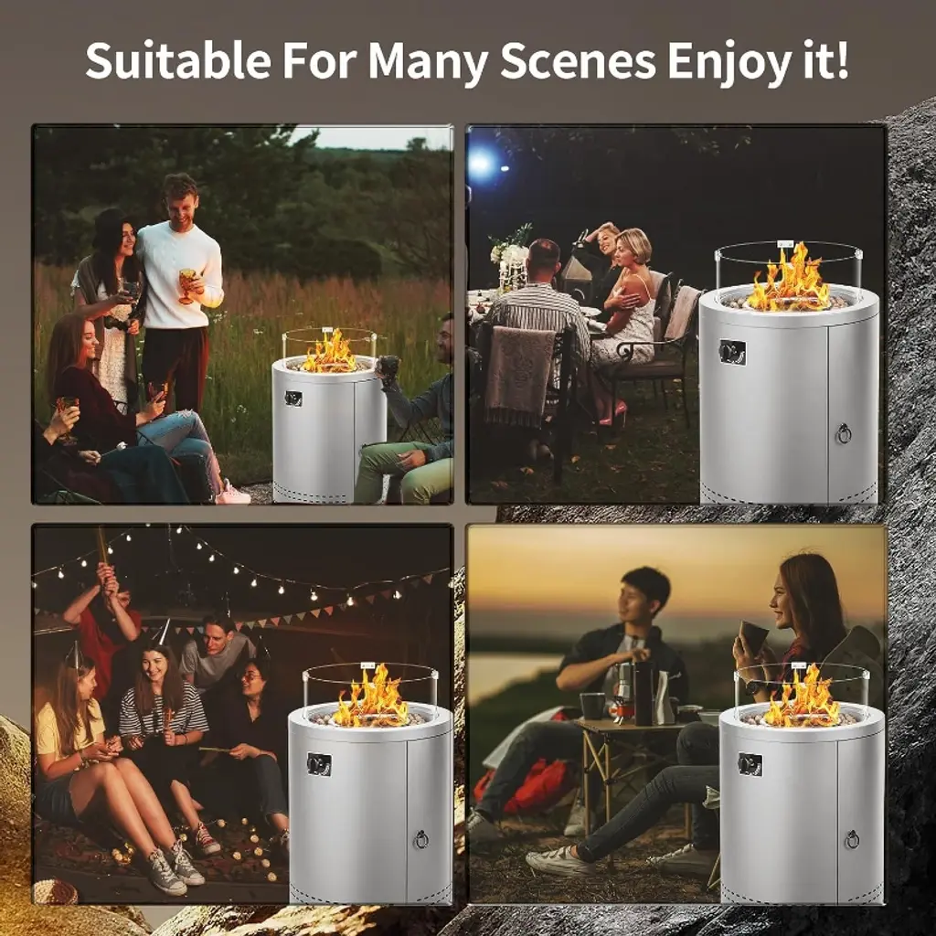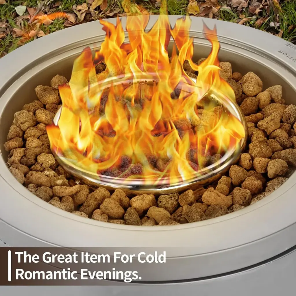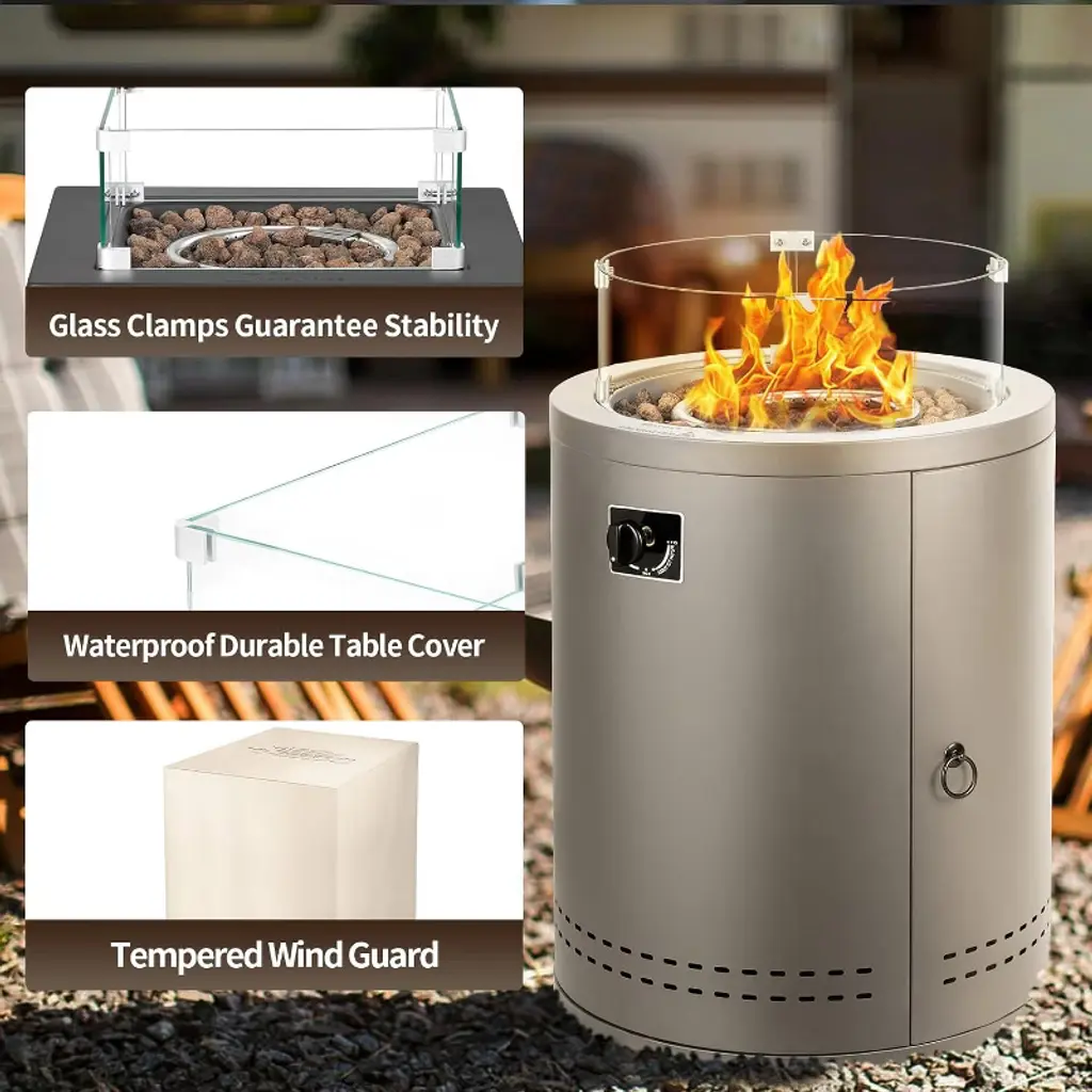 This 20-inch round steel fire pit table features knob ignition, ETL/CSA safety certifications, and a smoke-free propane design. Perfect for warmth & social gatherings, it doubles as a table with a wind guard for stability. Safe, eco-friendly, and stylish!