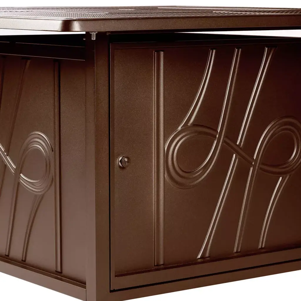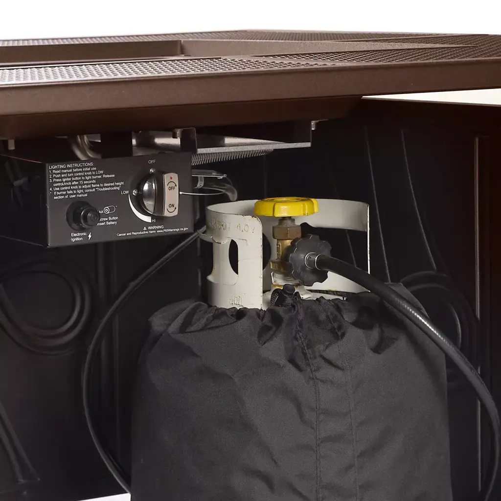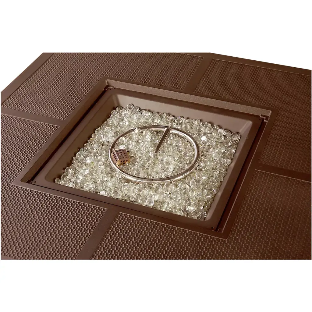 Bring the warmth and ambiance of this Square 42 in. x 42 in. Aluminum Propane Fire Pit Table with Glass Beads, Two Covers, Lid, 55,000 BTUs in Brown Finish to your patio, deck or backyard. Featuring a stylish clean durable powder coated finish, this fire pit is complete with a durable rust-free solid aluminum design base, making it an attractive centerpiece for your outdoor living space. Complete with a 55,000 BTU stainless steel burner and integrated ignition, you can enjoy all the ambiance of a classic fire without the mess or danger of tending ashes. All of the complicated electrical and gas control components are preassembled unlike other fire tables. This fire pit comes with clear fire glass, a table lid, propane tank cover and a protective table fabric cover. The dimensions for the propane fire pit table are: 42" L x 42" W x 24.5" H, 66.5 lbs