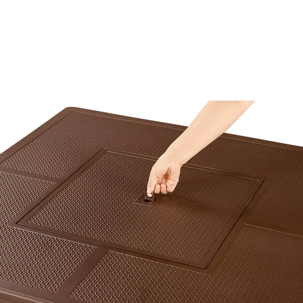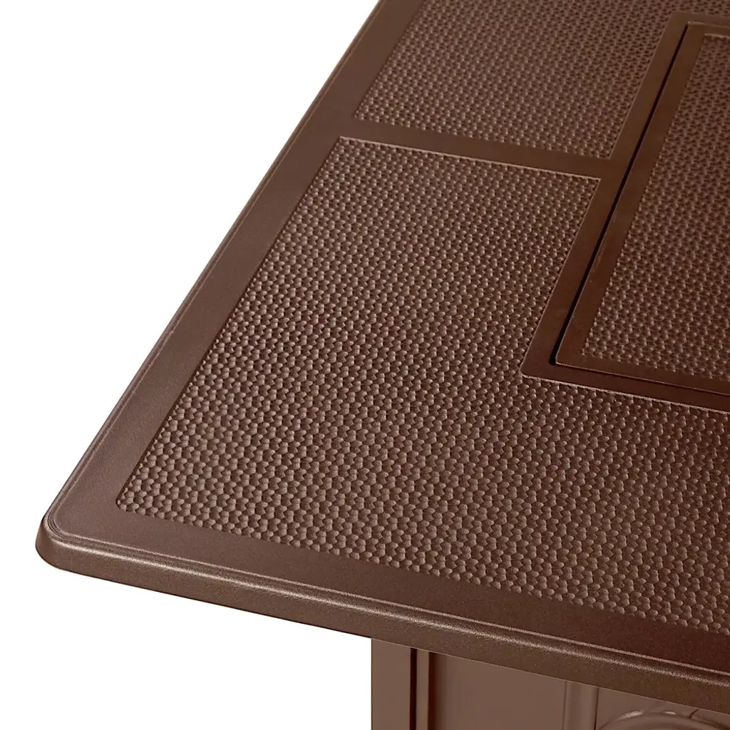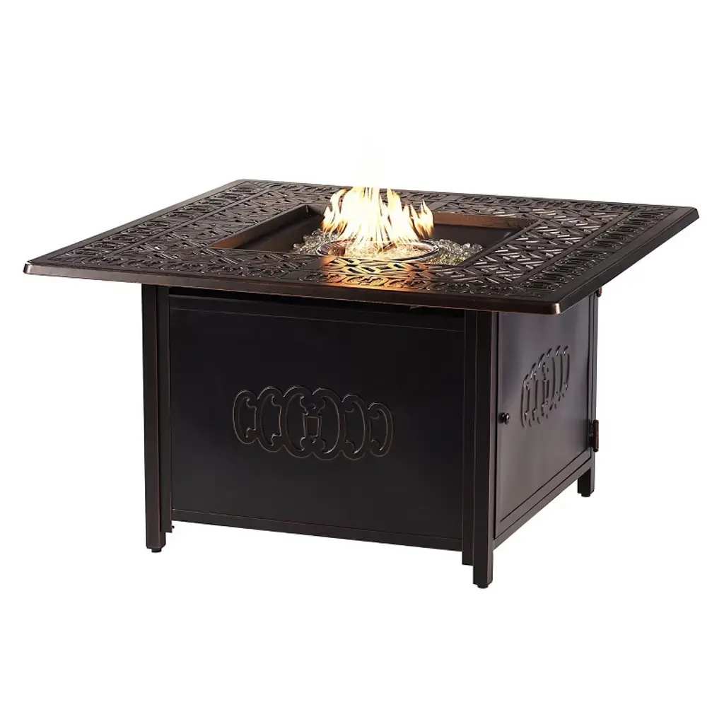 Bring the warmth and ambiance of this Square 42 in. x 42 in. Aluminum Propane Fire Pit Table with Glass Beads, Two Covers, Lid, 55,000 BTUs in Brown Finish to your patio, deck or backyard. Featuring a stylish clean durable powder coated finish, this fire pit is complete with a durable rust-free solid aluminum design base, making it an attractive centerpiece for your outdoor living space. Complete with a 55,000 BTU stainless steel burner and integrated ignition, you can enjoy all the ambiance of a classic fire without the mess or danger of tending ashes. All of the complicated electrical and gas control components are preassembled unlike other fire tables. This fire pit comes with clear fire glass, a table lid, propane tank cover and a protective table fabric cover. The dimensions for the propane fire pit table are: 42" L x 42" W x 24.5" H, 66.5 lbs
