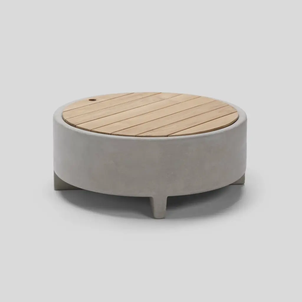 Hand cast with glass fiber reinforced concrete, our Rook Fire Table brings the heat. Incredibly warm and highly durable, its sculptural rounded design and lava rocks encourages gathering, day or night. A slatted teak lid acts as a versatile cover and coffee table surface. Includes concrete propane cover. Also available for use with natural gas.