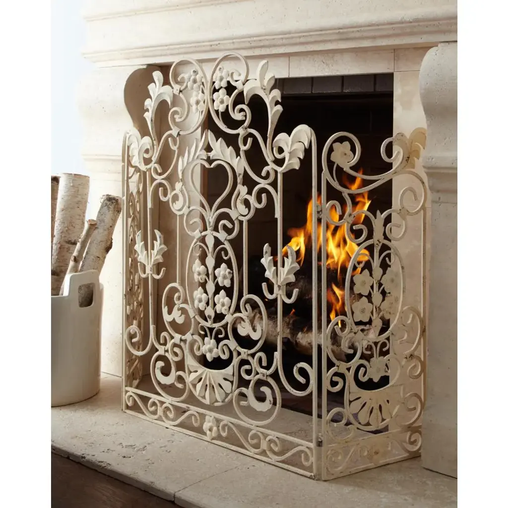 3-Panel Antique White Iron + Tole Spring Floral Design Fireplace Screen