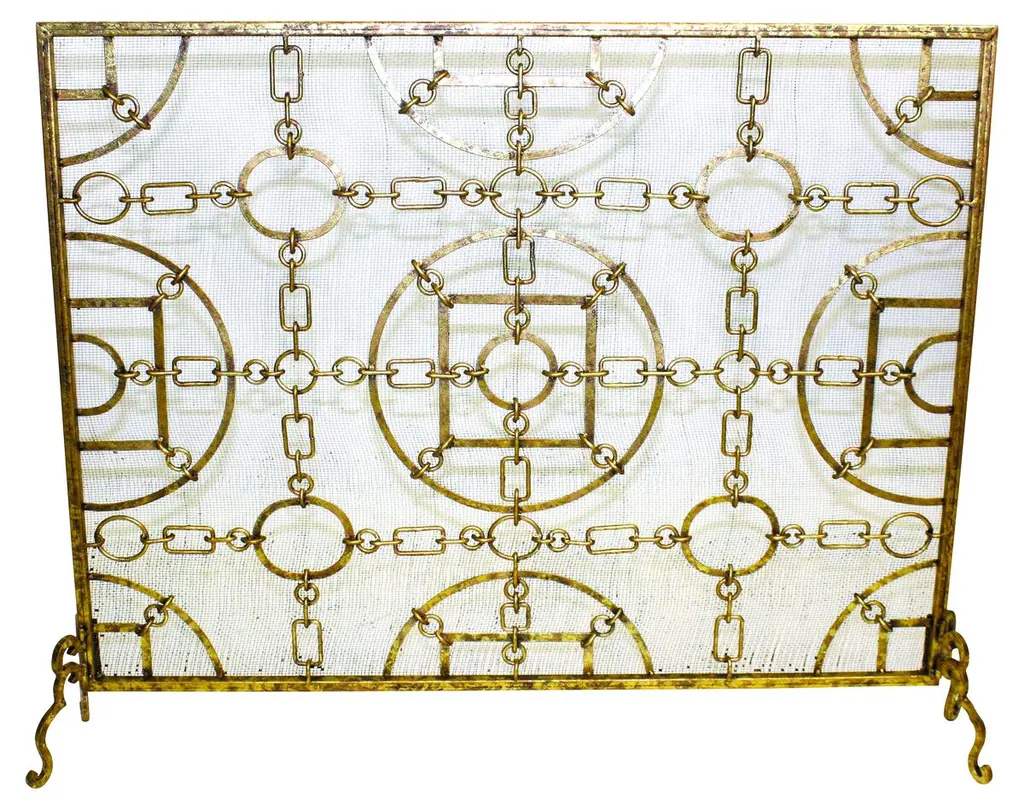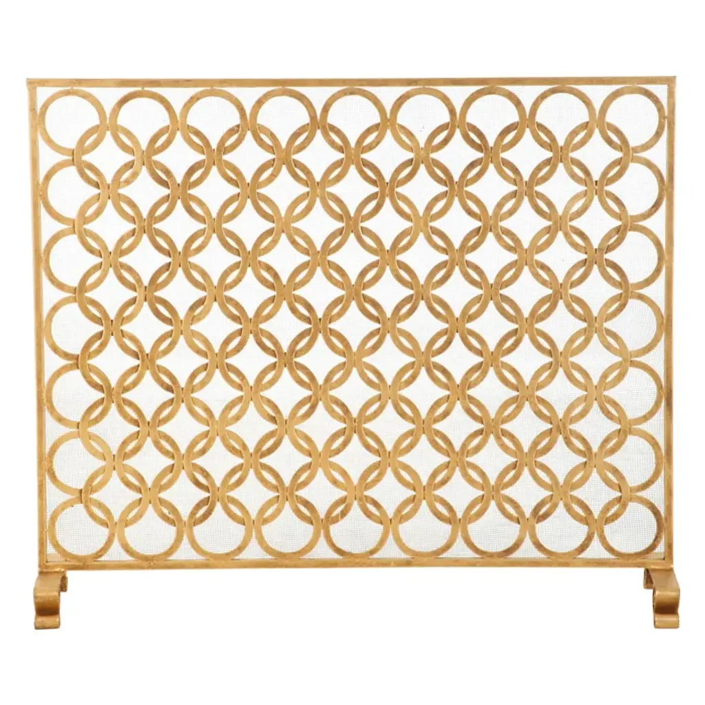 Backed in mesh to keep sparks and ash at bay, this gorgeous single-panel fire screen gleams with an eye-catching golden geometric motif.