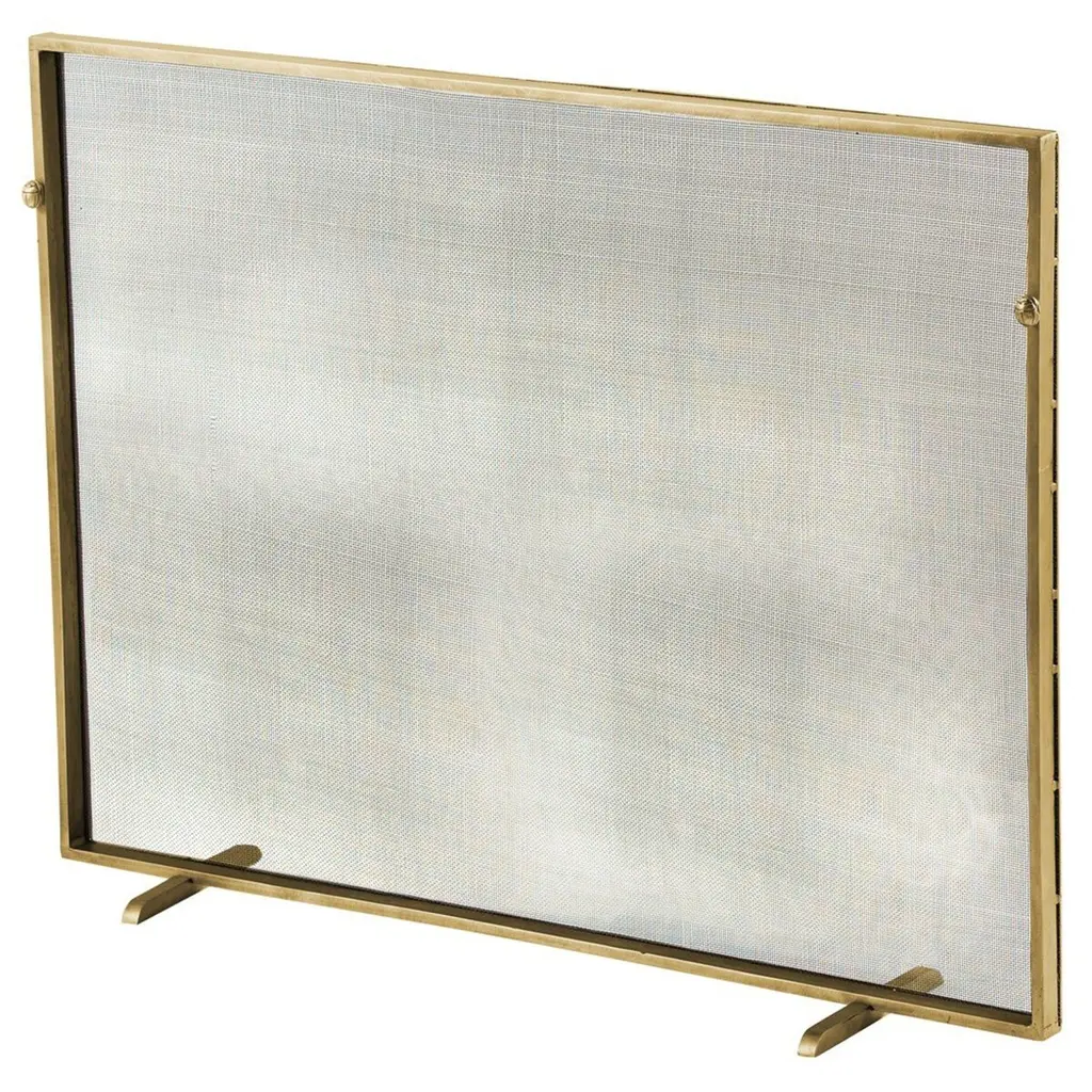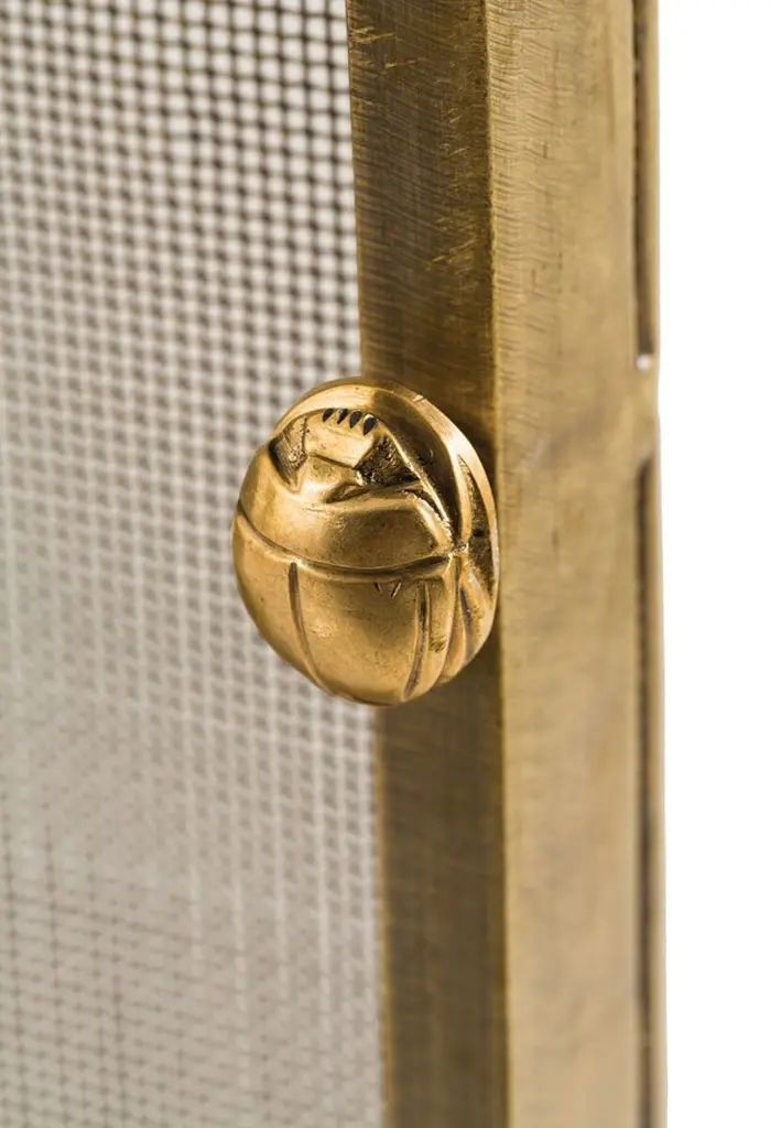 Simple yet elegant, this clean-lined fireplace screen is crafted of brass-plated iron with an iron-mesh backing. The frame is punctuated by detailed knobs in the form of scarabs, the Egyptian beetle that has been thought of as a talisman of hope and good luck.