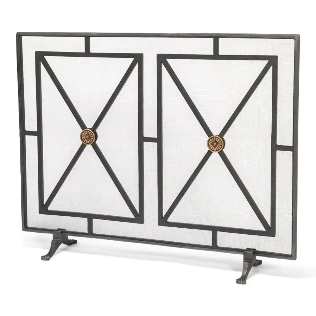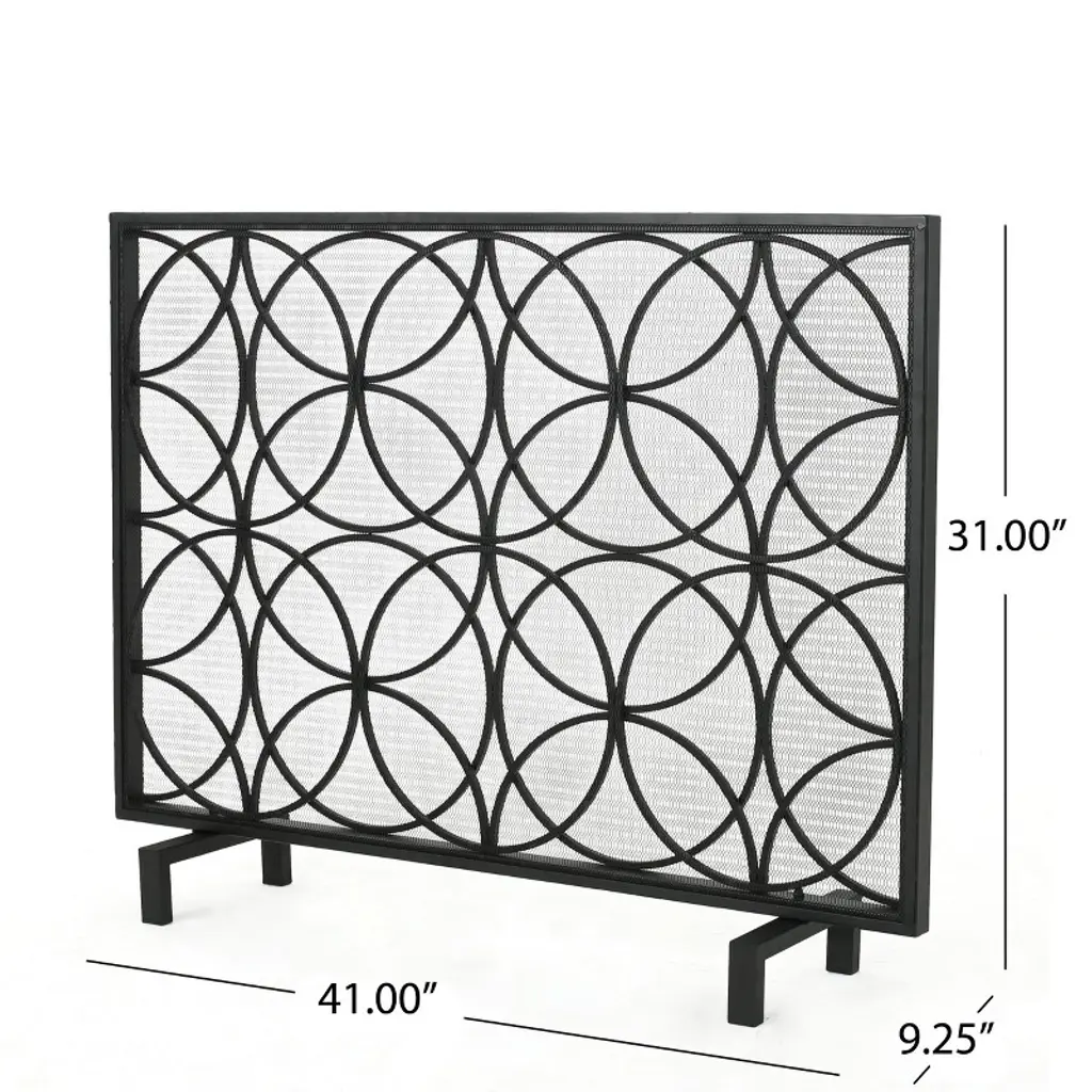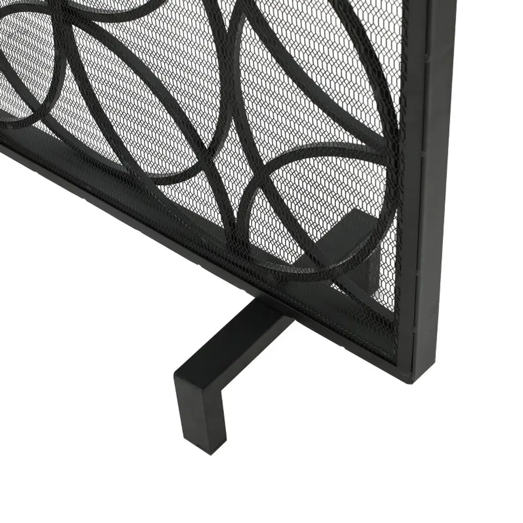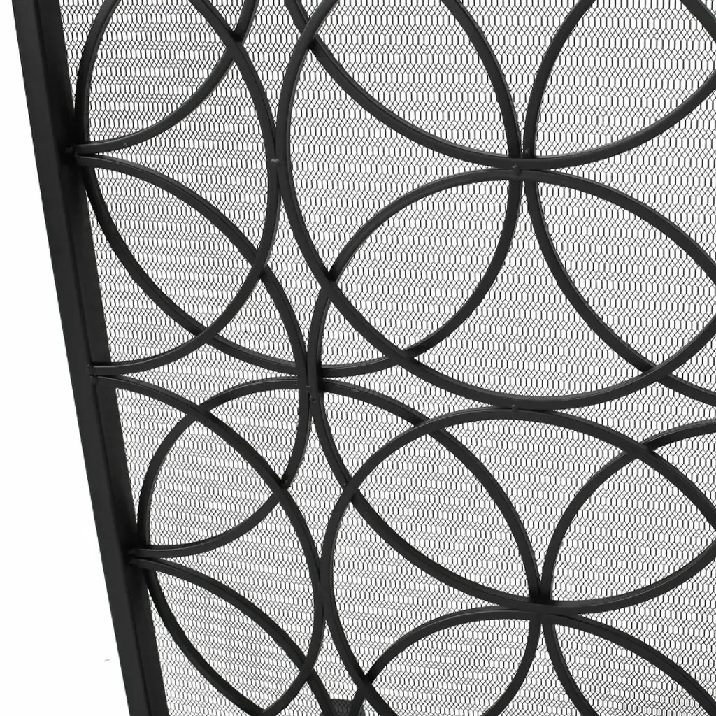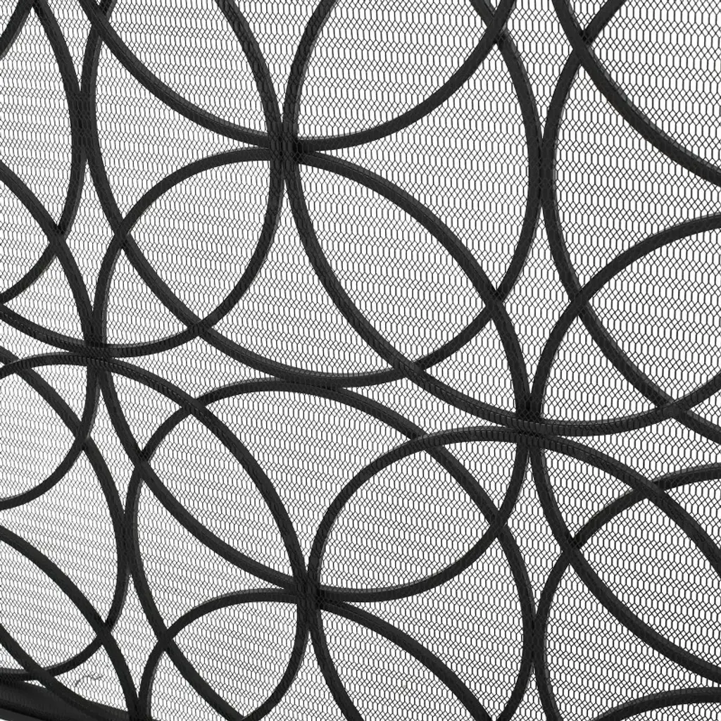 This 41" black iron fireplace screen features an overlapping circle pattern for modern style. The single-panel mesh blocks embers while radiating heat. Easy assembly with included tools.