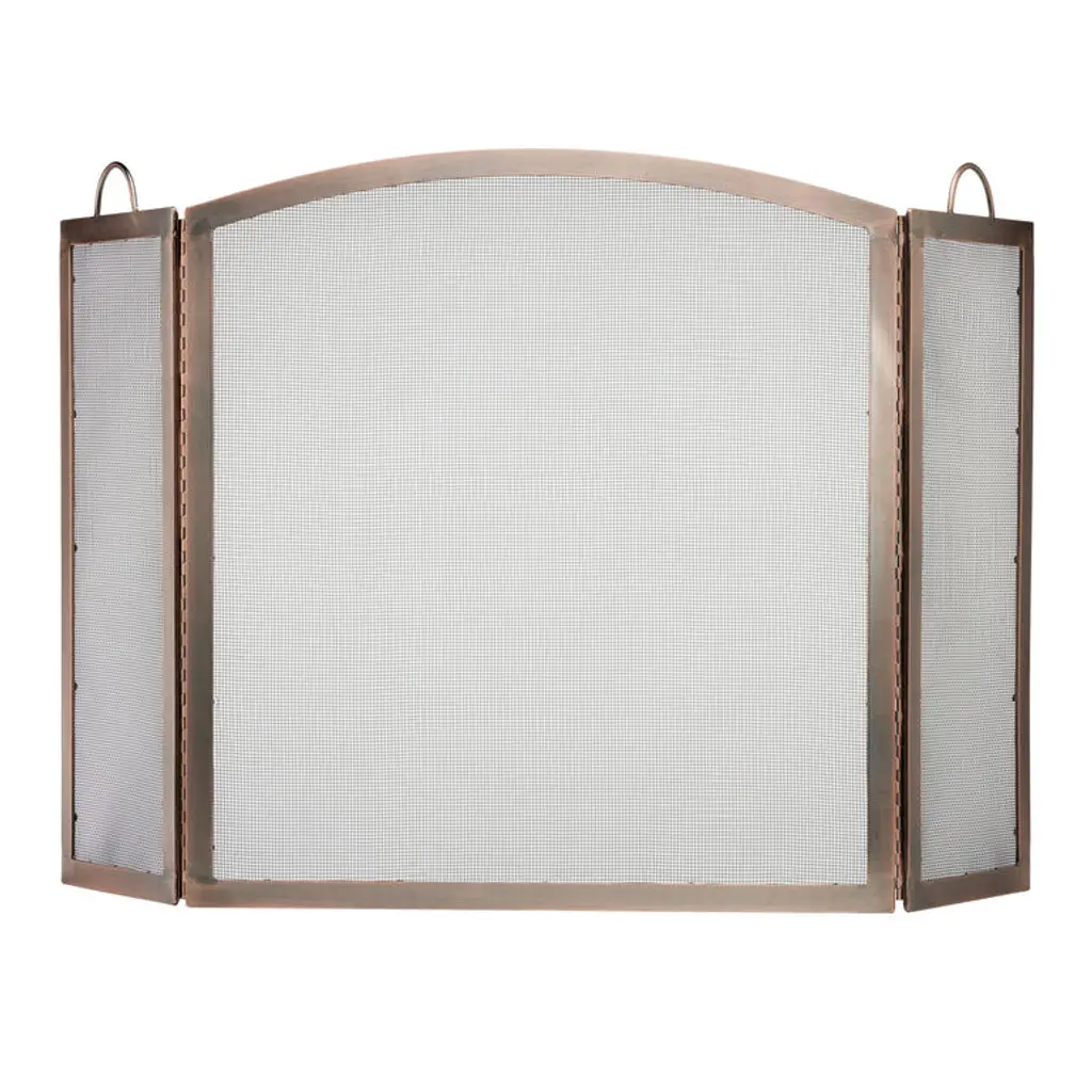 Tightly woven with steel mesh on a foldable wrought-iron frame, this 3-panel fireplace spark screen features an arched center screen and an antique-copper finish. Adding a classically elegant design to your hearth without blocking your view of the flames, this large see-through folding screen shields decor, children or pets from dangerous sparks and embers. Its adjustable 3-fold frame and twin handles allow for easy access to your firebox.