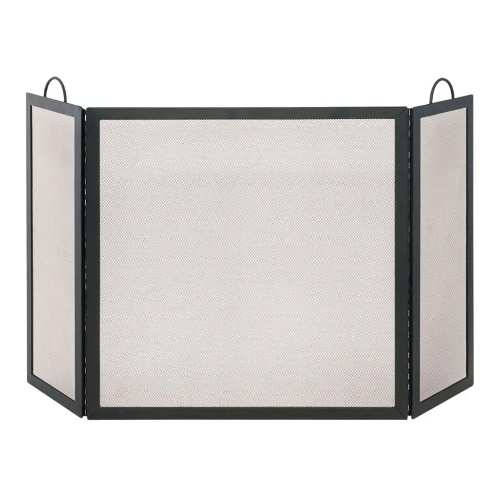 Tightly woven with steel mesh, this 3-panel fireplace spark screen features a foldable frame in a black wrought-iron finish topped with two handles for easy carrying. Adding a clean-lined traditional design to your hearth in two sizes, this see-through folding screen shields decor, children or pets from dangerous sparks and embers. Its adjustable 3-fold frame and twin handles allow for easy access to your firebox.