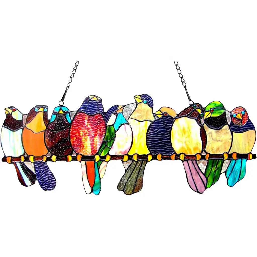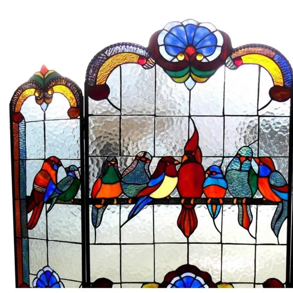 Chloe Lighting Aves Tiffany-glass Gathering Birds Design 3Pcs Folding Fireplace Screen 40" Wide