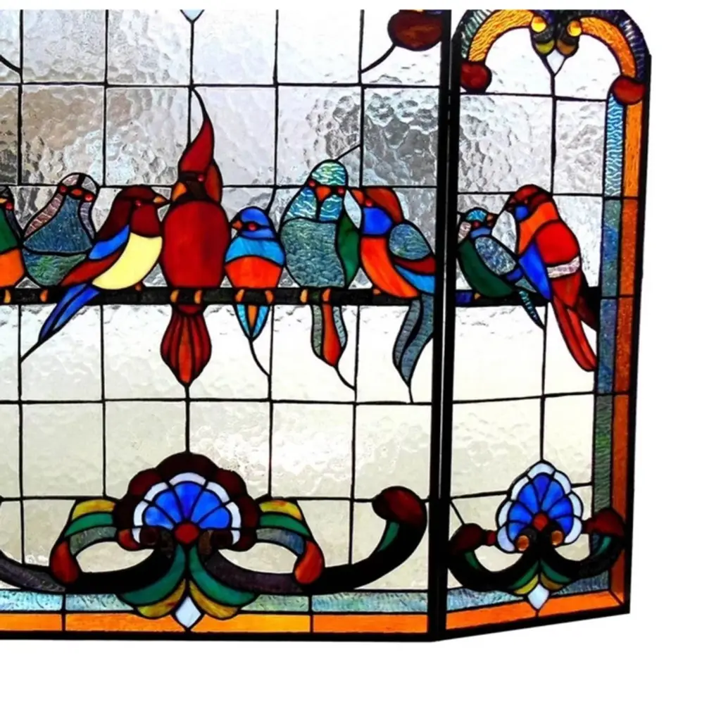 Bring charm and artistry to your hearth with the AVES 3-panel Tiffany-style fireplace screen. Featuring 541 individually hand-cut stained glass pieces and 28 colorful beads, this screen showcases a delightful gathering of birds in radiant hues of red, blue, yellow, and green. Crafted using classic copper foil techniques, it not only enhances safety but also transforms your fireplace into a work of art. Key Features: Vivid multi-color bird design on hand-cut stained glass3-panel folding screen with sturdy textured black frameHandcrafted using authentic Tiffany-style copper foil methodsUL and cUL listed for safe indoor useDimensions: 32"H x 40"W x 0.18"D |Net Weight: 17.6 lbs Turn your fireplace into the focal point of the room with artistic flair and timeless warmth.