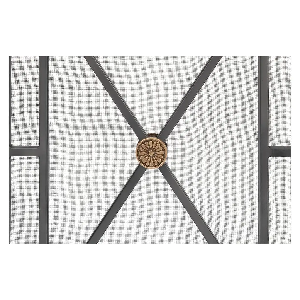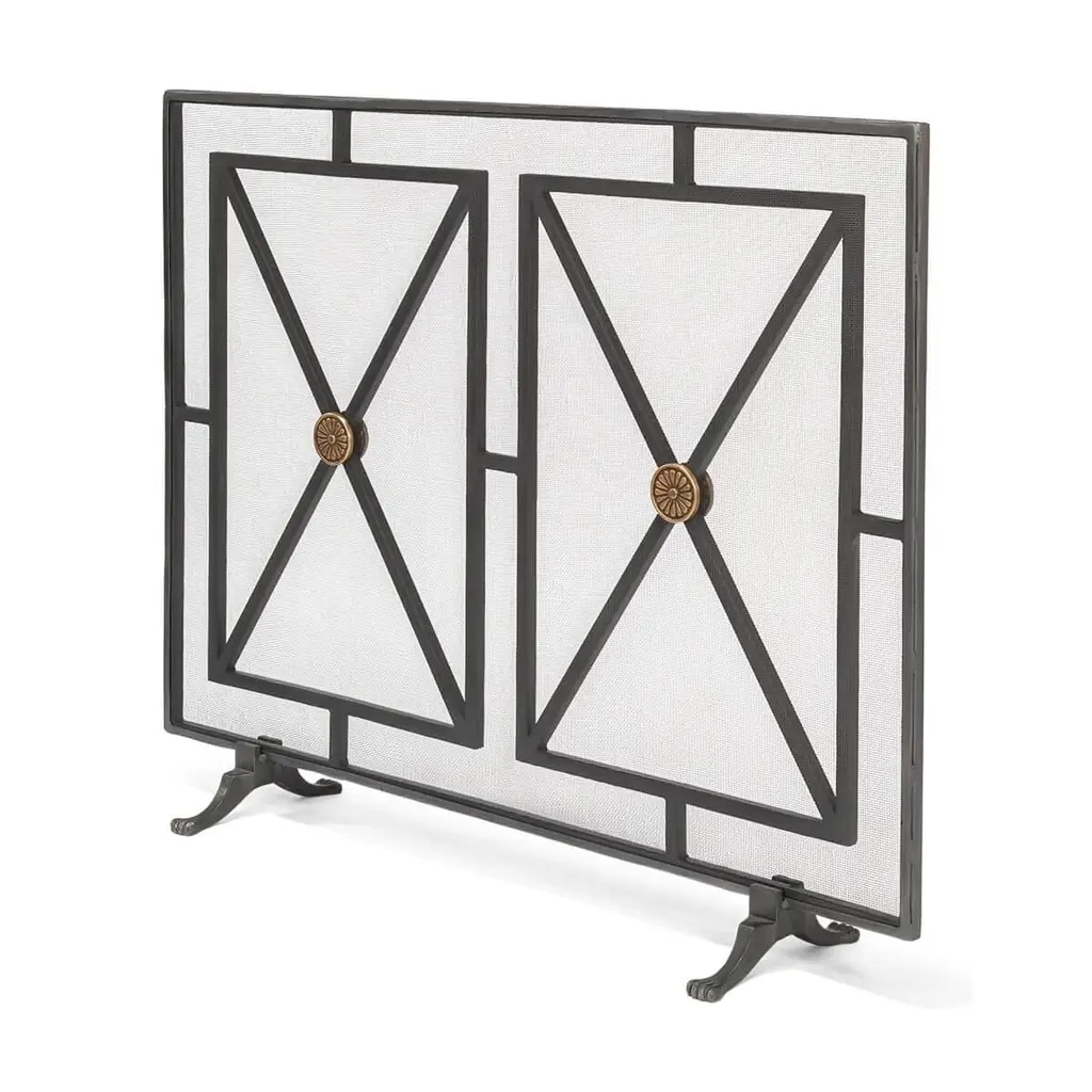 A French Directoire style dark grey iron paneled fireplace screen with X frame panels centered with gold rosettes and raised on paw feet.Dimensions38" W x 9" D x 30" H.