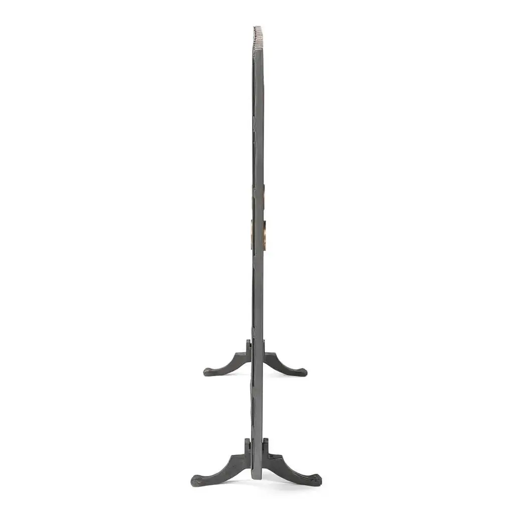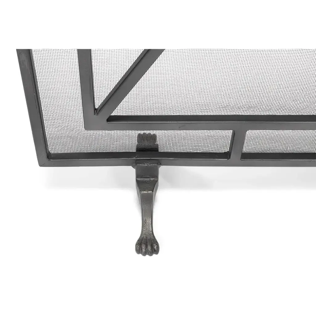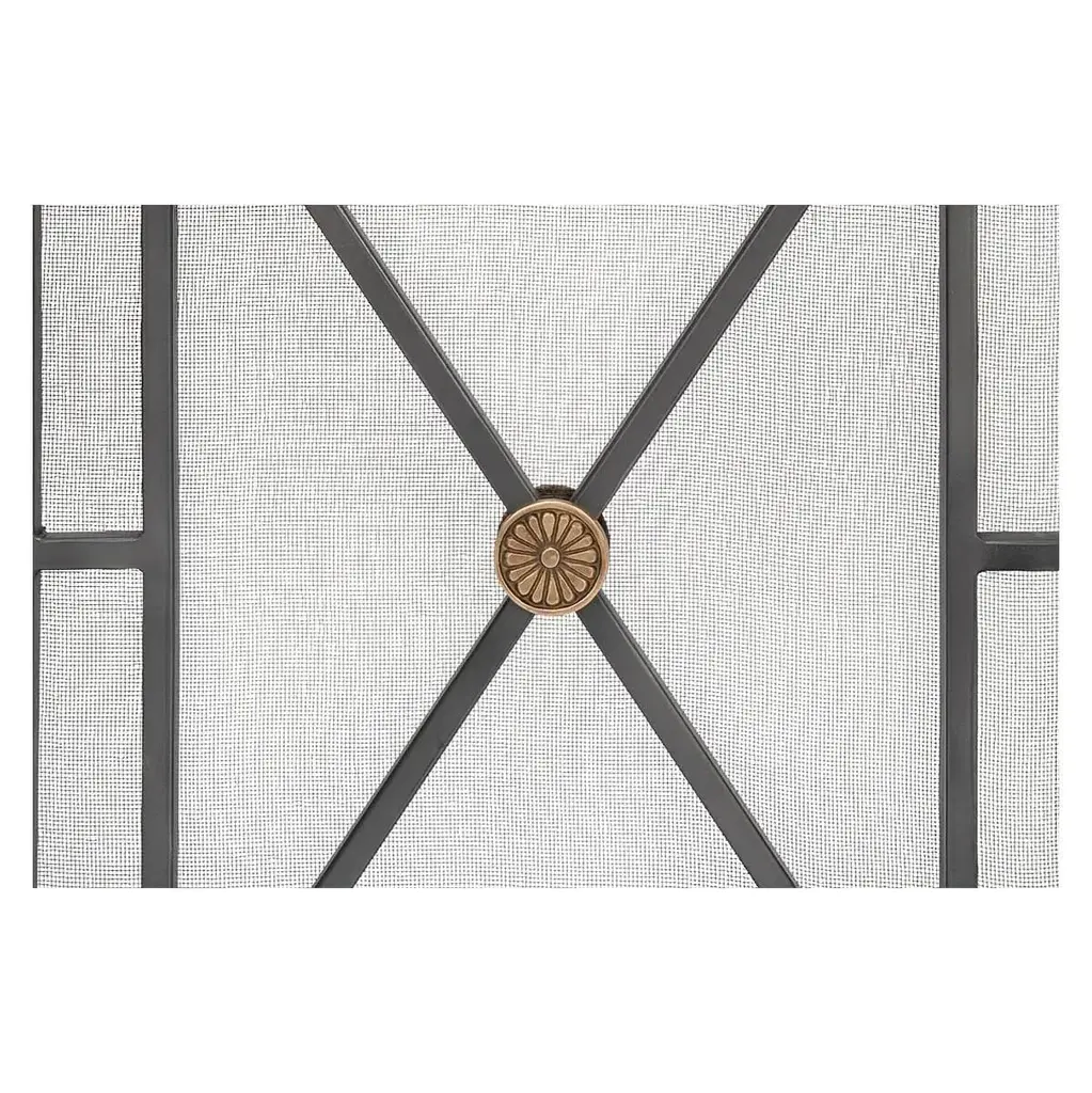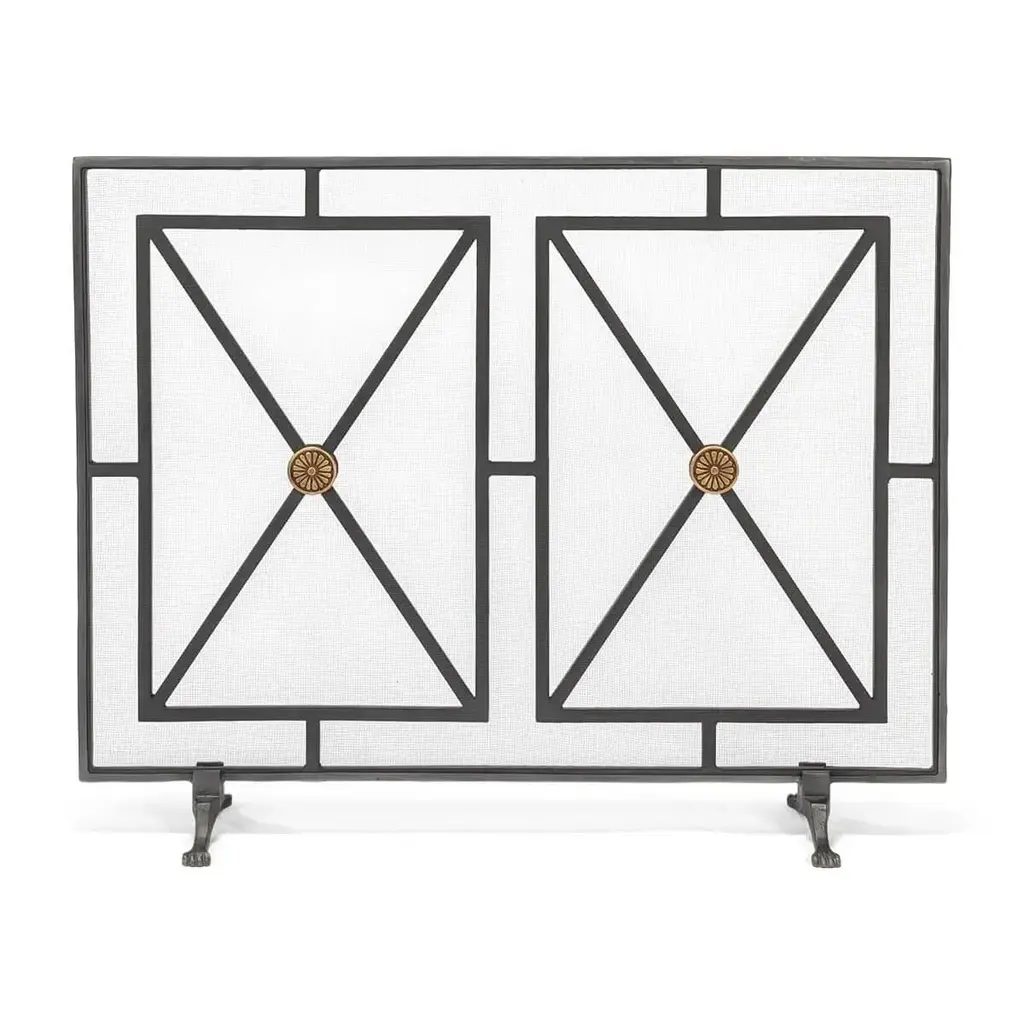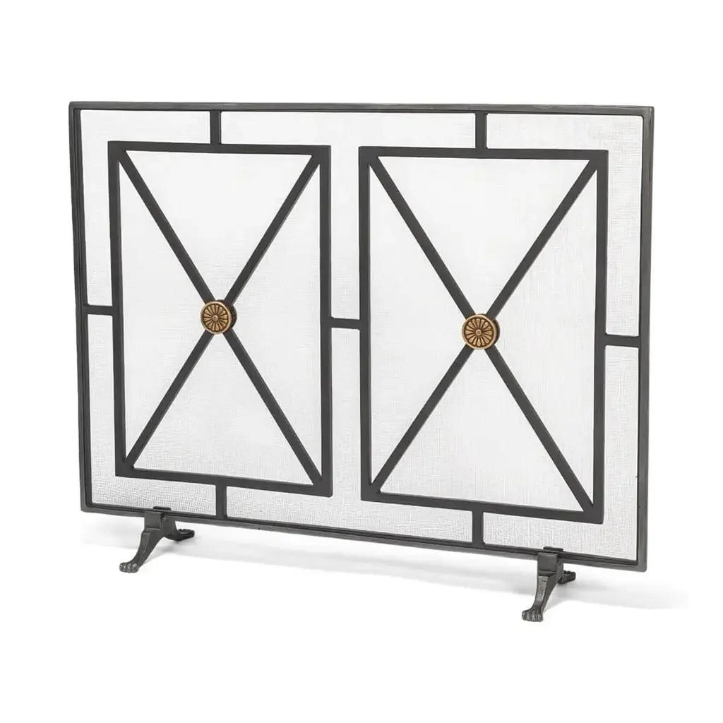 dark grey iron paneled fireplace screen with X frame panels centered with gold rosettes and raised on paw feet. DIMENSIONS 38" W x 9" D x 30" H