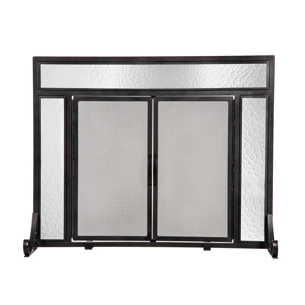 Our Pettite Manchester Fireplace Screen is the perfect addition for any fireplace. Heavy-duty mesh safely contains sparks, while the design fits any decor.The two-door design makes fire tending easy and safe. Magnetic closures allow you to open the doors easily and keep doors safely closed for added peace of mind. The doors open wide to make your entire firebox is accessible when adding logs or stoking the flames.Piano hinges on the doors offer full-length support and long-term alignment; adjustable back feet to fit any fire box and uneven hearths. Black finish; rubbed antique brass/black accents.