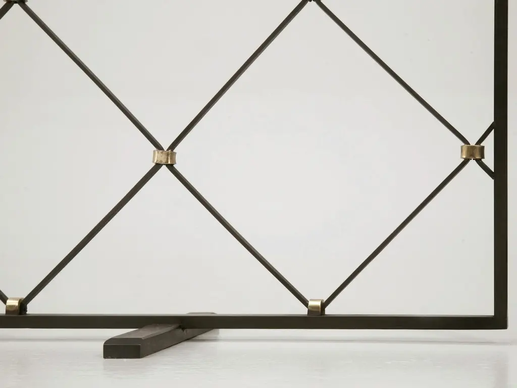Mid Century Modern Custom designed Steel Fireplace Screen with Brass Fittings made in our Old Plank Workshop. This style is very indicative of French 40's as well as Art Deco. We can reproduce this screen in custom sizes, shapes, or colors. Make it your own! We are pleased to accommodate your design needs. Send us your desired dimensions and materials and we will make it possible.