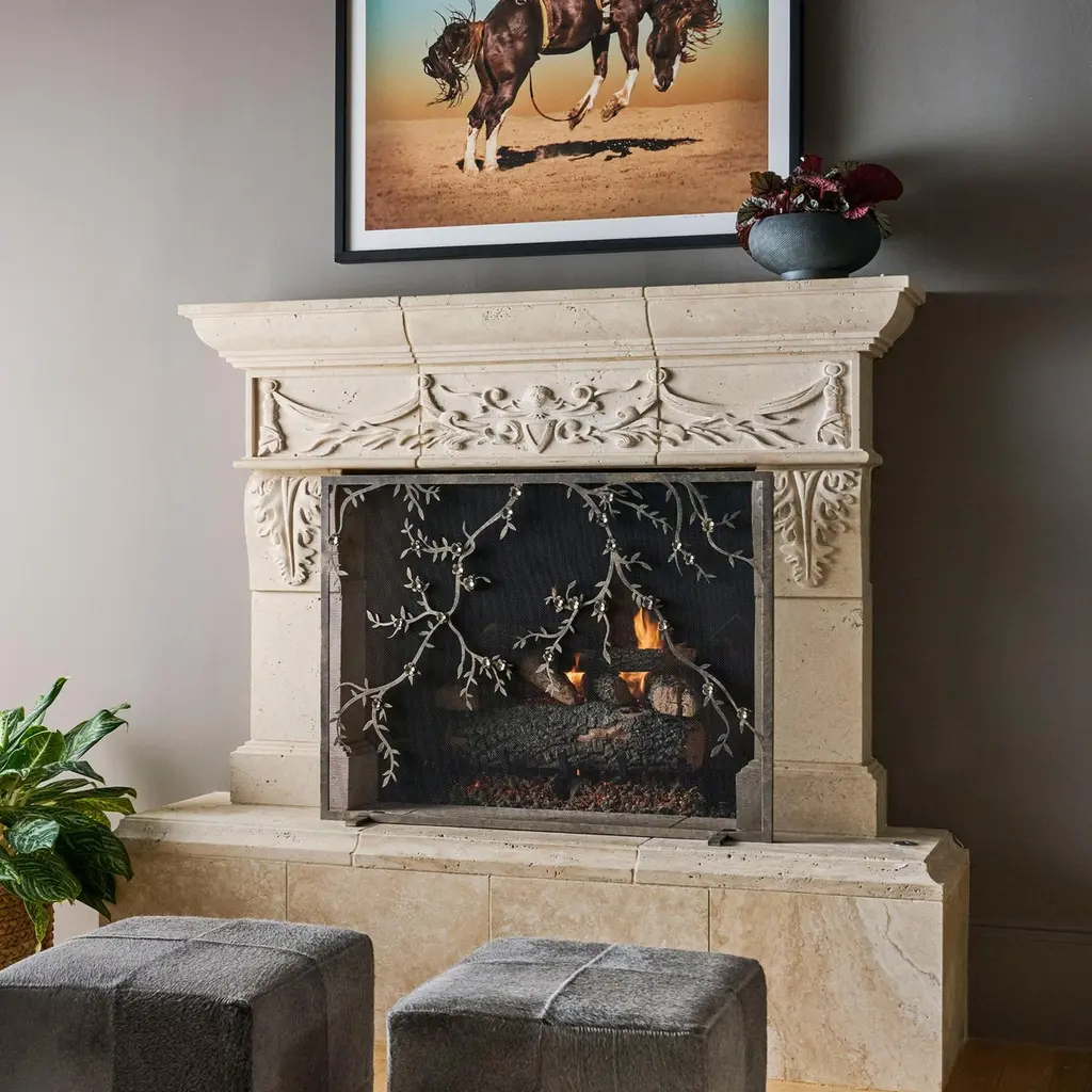 Introducing the Plum Blossom fireplace screen – an eye-catching design that combines the beauty of nature with the warmth of the hearth. Each made to order screen combines silhouetted branches with layered petals to create a playful and delicate dimensional design. Customizable in size and finish, it transforms your space into an inviting sanctuary, blending artistry with functionality. Inspired by the elegant, delicate beauty of plum blossoms opening in the spring, the Plum Blossom fireplace screen is made of forged iron flowers and buds. The flowers’ subtly textured petals form a soft and feminine look. Each detail is created by hand, then individually applied as a one-of-a-kind detail. This results in a singular work of art as no two screens will be exactly alike. The Sakura Fire Screen comes with a wire mesh backing to protect from stray embers.Made in the United States by expert craftsmen, our screens are designed to fit seamlessly in with any setting. Each piece is unique, with slight variations, due to the artisan nature of our hand-applied finishing process. Handmade in the U.S.A., it ships in 6-8 weeks.