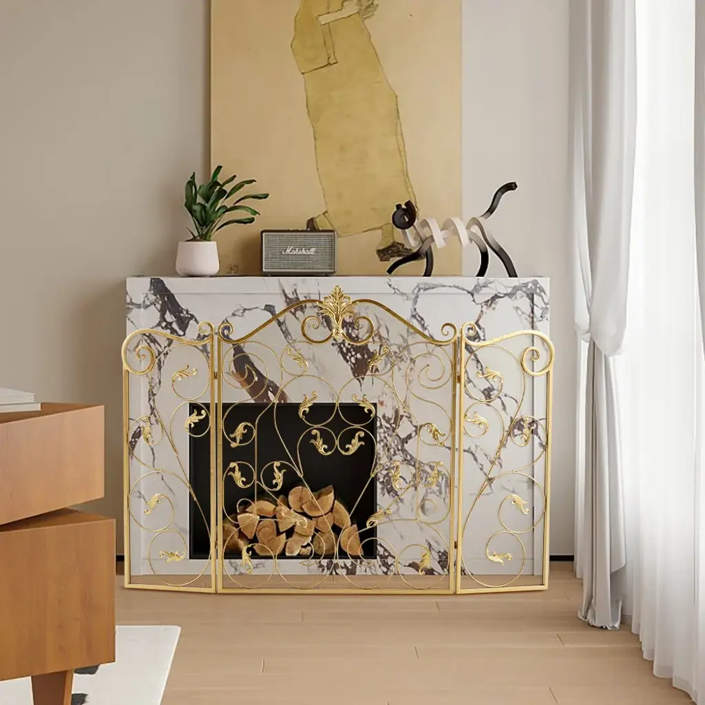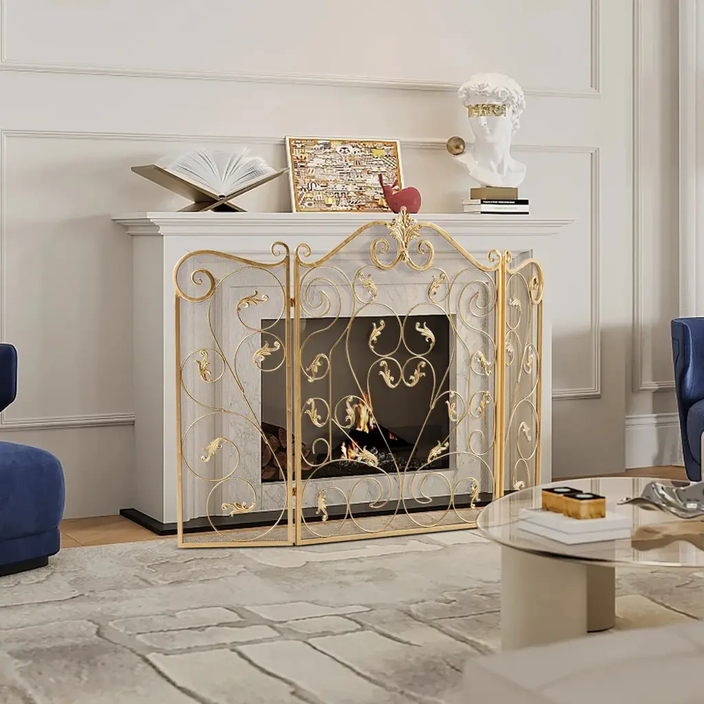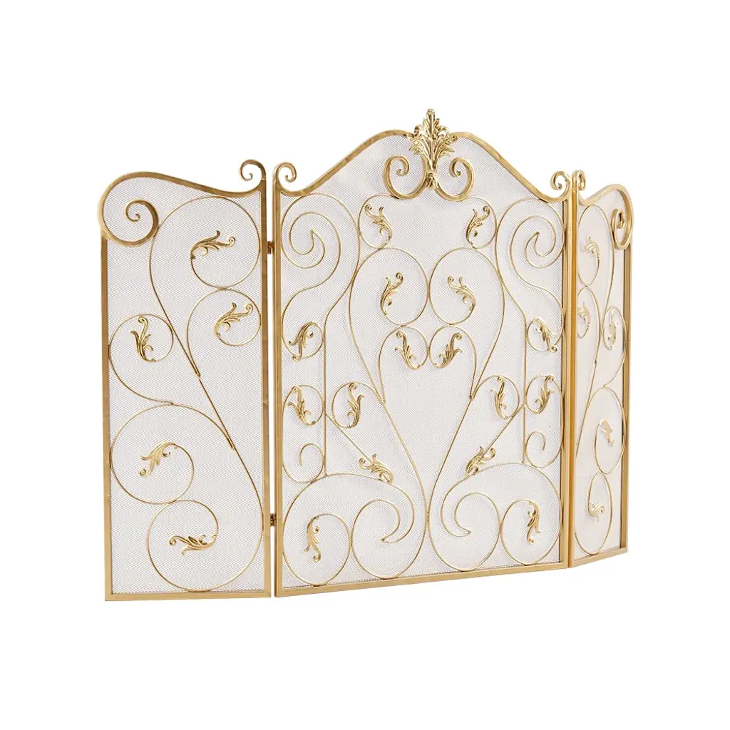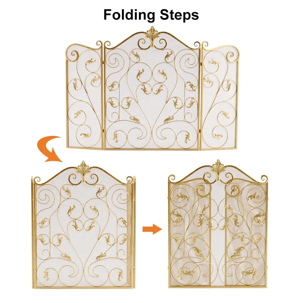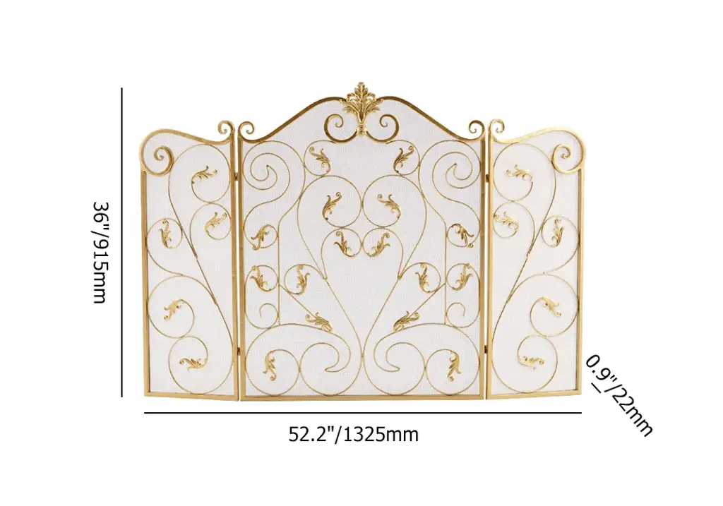 Retro Gold 3-Panel Foldable Scroll Fireplace Screen With Acanthus Leaf Metal