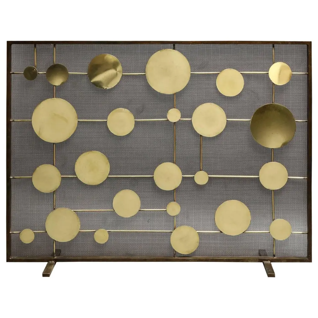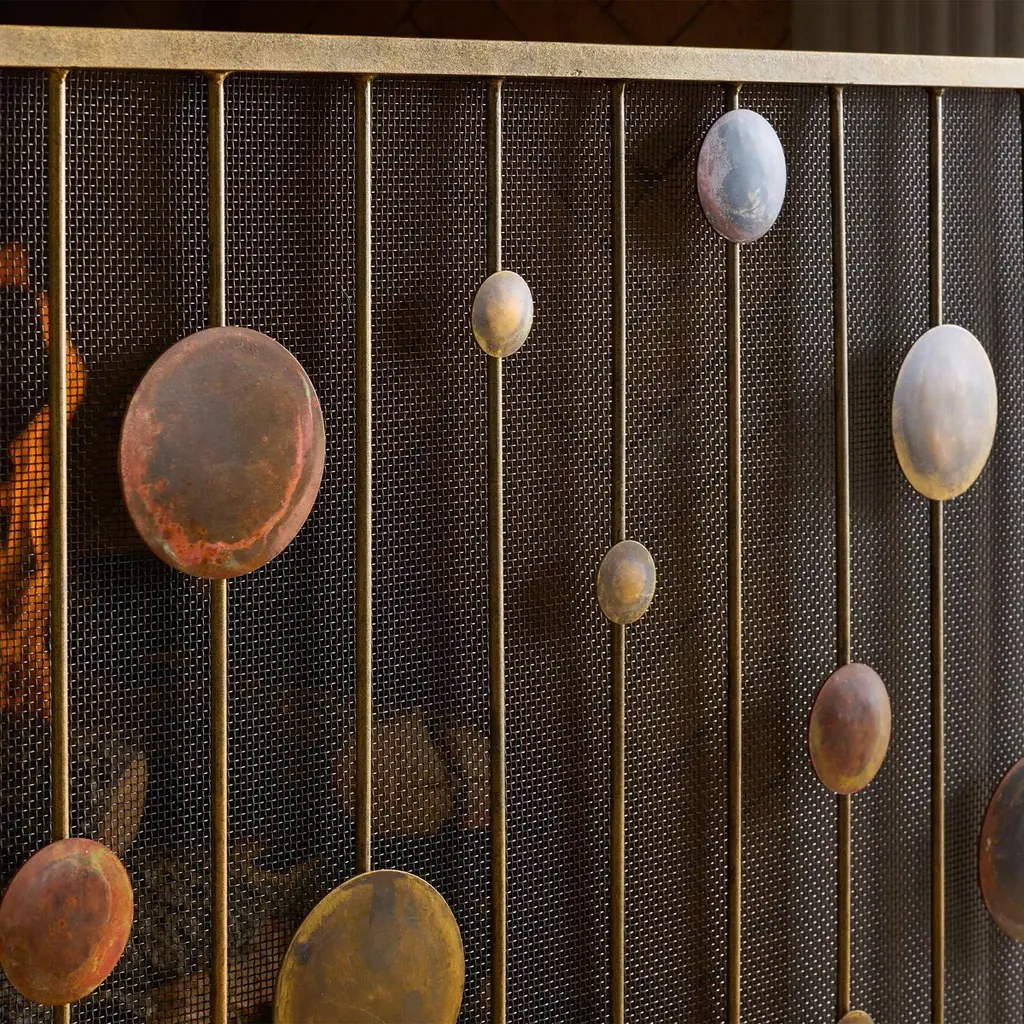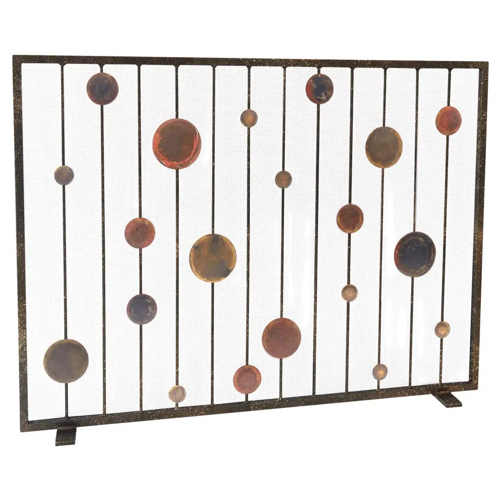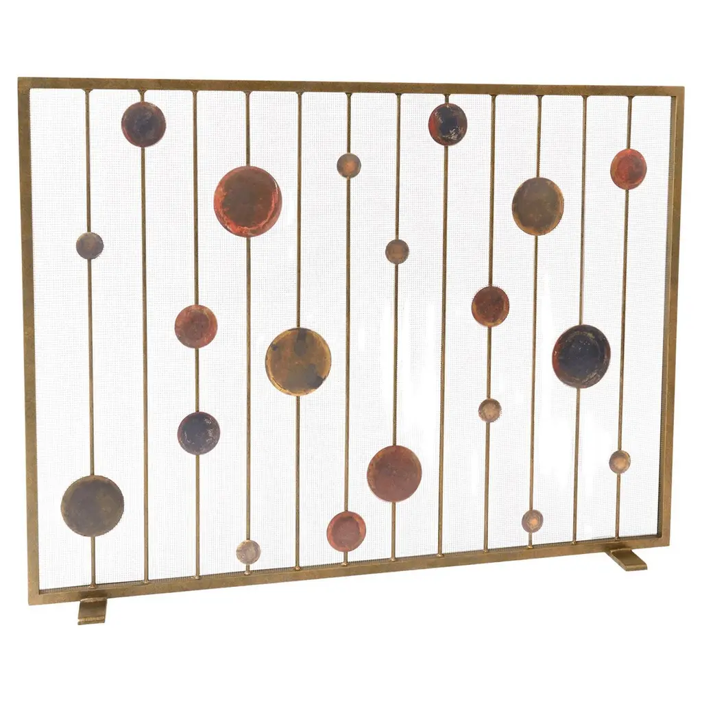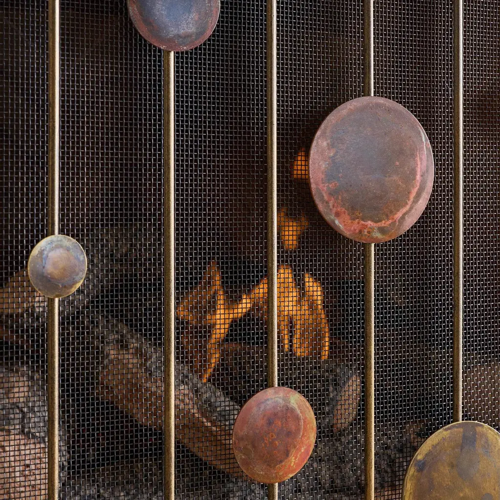 Inspired by the rhythm and balance of mid-century modern design, the Striker Fireplace Screen brings a sculptural presence to the hearth. Hand-patinated metal discs are thoughtfully suspended between slender vertical bars, creating a sense of movement and harmony that nods to the geometric elegance of the 1950s and ’60s. Each disc is individually finished by hand, highlighting the craftsmanship behind this simple yet artful composition. Striker’s captivating silhouette and vintage-inspired detailing make it an ideal fireplace screen for interiors that blend organic modern, contemporary, or mid-century style. Whether anchoring a sleek living room or adding visual interest to a more layered space, it offers a quietly striking focal point with timeless appeal.PATINA WILL VARYMade in the United States by expert craftsmen, our screens are designed to fit seamlessly in with any setting. Each piece is unique, with slight variations, due to the artisan nature of our hand-applied finishing process. Handmade in the U.S.A., it ships in 6-8 weeks.