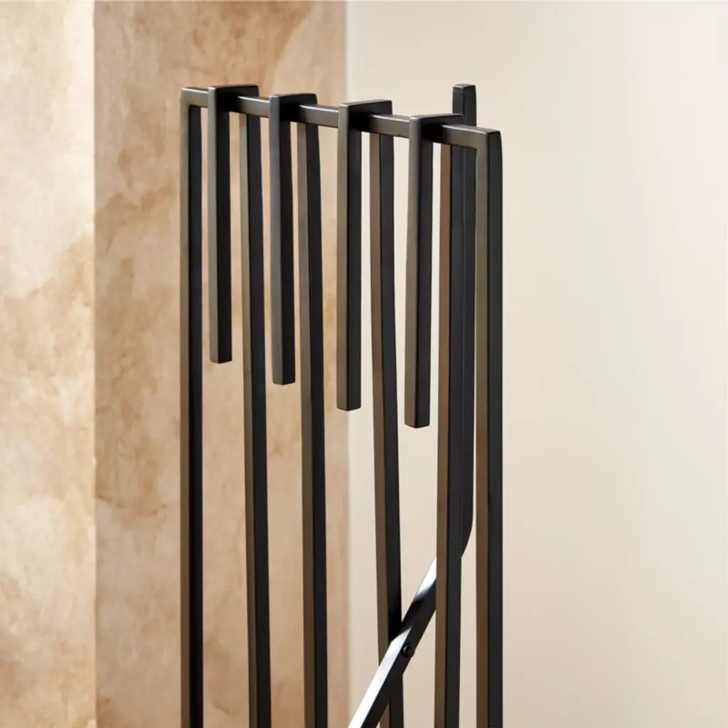 Handcrafted of iron with a black finish, refined fireplace tools hang out of the way for a clear view of the hearth. Shovel, broom, poker and tongs hook over a freestanding bar via sleek squared-off handles. Tends the fire indoors or out. CB2 exclusive.