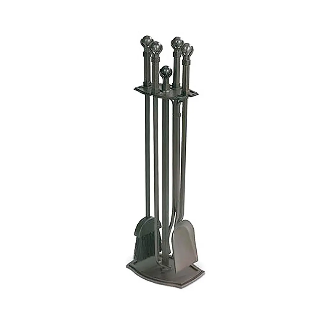 Crafted of cast iron and steel with cylinder handles and a traditional bronze finish, this tool set includes everything you need to tend to a roaring fireplace. It includes a poker for adjusting burning logs, a broom for brushing up soot, fire tongs for arranging kindling, a shovel for scooping ashes and a vertical stand to hang everything together. Durable and balanced with long handles, these classic fire tools keep you safe in style.
