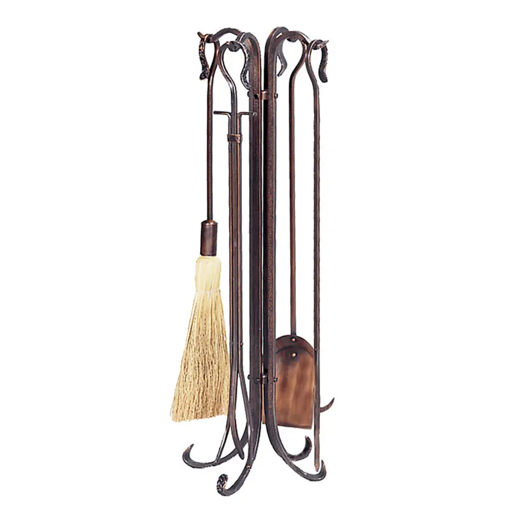 Hammered Copper Iron Crook Handle 5 Piece Fireplace Tool Set