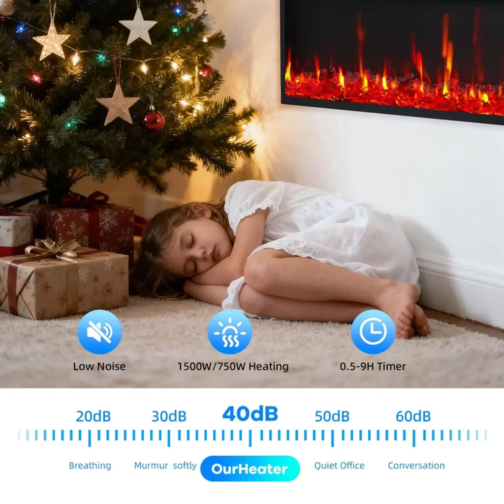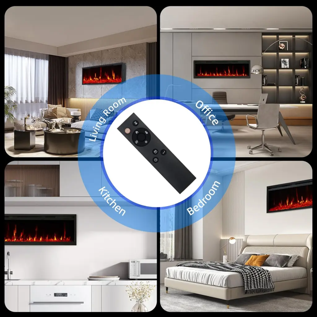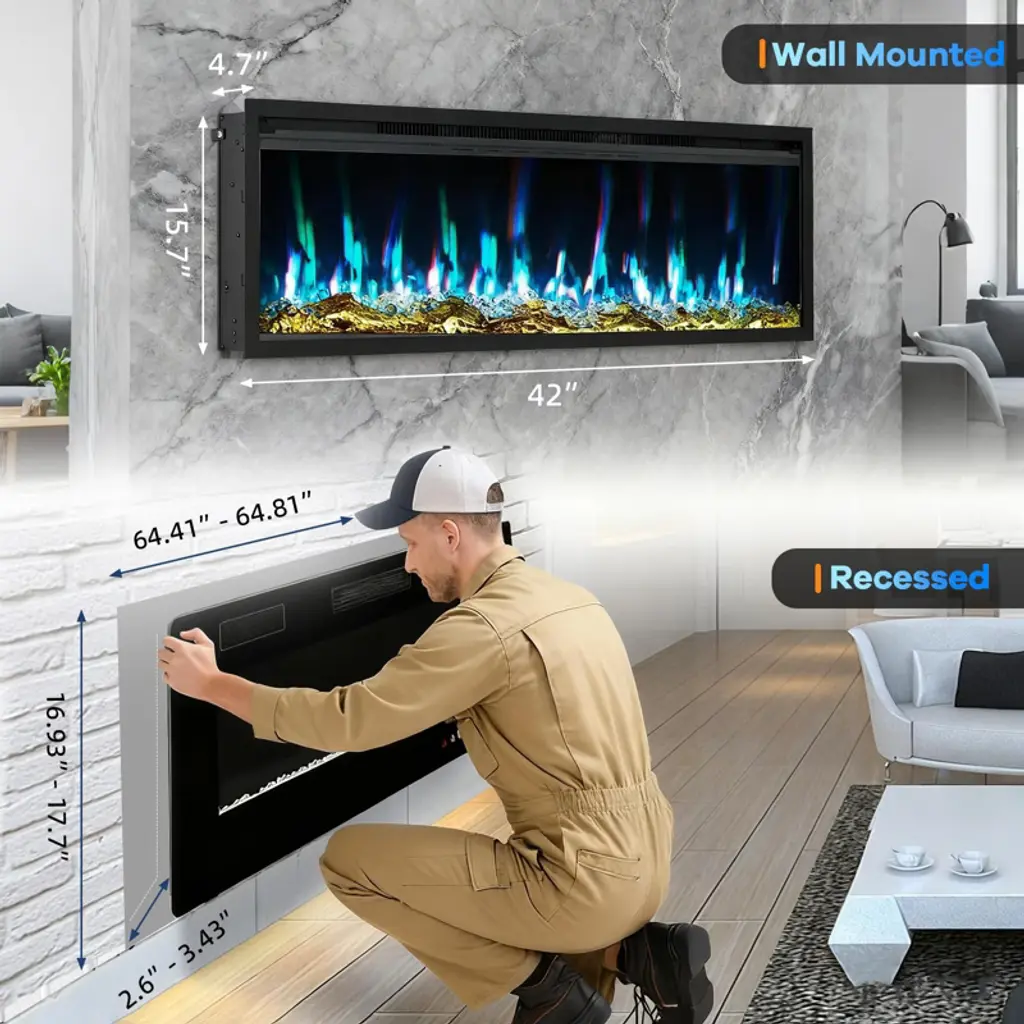 Flames Without the FrameworkTransform any room with this whisper-thin heating masterpiece - realistic flames meet efficient warmth in just 4.2 inches of depth.✨ Why Architects Choose This→ Thinnest Profile: 0.8" slimmer than industry average→ Versatile Install: Frames included for recessed/wall-mount→ True Year-Round Use: Flame-only mode for summer ambiance→ Commercial-Grade Glass: 5mm tempered safety front→ Instant Heat: Warms 25°F faster than basic models? Perfect Applications• Living Rooms: 68" model as media wall centerpiece• Bedrooms: 42" with sleep timer for cozy nights• Office Lobbies: Professional 50" crystal display• Dining Rooms: 60" with adjustable amber glow• Apartments: Zero-clearance corner installation? Technical Specifications• Sizes: 42" | 50" | 60" | 68" W• Depth: 4.2" (unit) | 3.5" (recessed cavity)• Voltage: 120V/60Hz• Heat Output: 5,120 BTU (1500W)• Sound Level: <36 dB• Glass: 0.2" tempered black⚠️ Critical Installation Notes• Recessed Requirement: 14.5" H × [W+0.5"] × 3.5" D cavity• Ventilation: 6" front clearance mandatory• Power: Dedicated 15-amp circuit recommended• Surface Temp: 113°F max during operation• Avoid: Bathrooms/outdoor use?️ Control FeaturesTouchscreen + IR remoteSeparate flame/heat controlsMemory function saves preferencesChild lock capability? IncludesFirebox with pre-attached glassRecessed mounting bracketsWall-mount hardware kitRemote + batteriesLog/crystal media setsWinter Just Got Warmer. Summer Got Sexier.