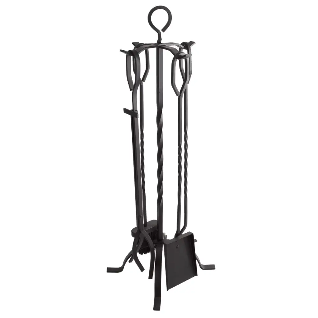 Maintain a cozy, relaxing fire in your indoor or outdoor gas fireplace, wood-burning stove, or fire pit using this 5-Piece Fireplace Tool Set by Lavish Home. Constructed of durable wrought iron with a matte black finish, each scroll patterned set includes a fire poker, shovel, broom, tongs, and a space-saving vertical stand with built-in hooks to hang tools. These essential fireplace accessories can withstand extreme heat conditions and come with looped handles for a secure, comfortable grip when you tend the fire.