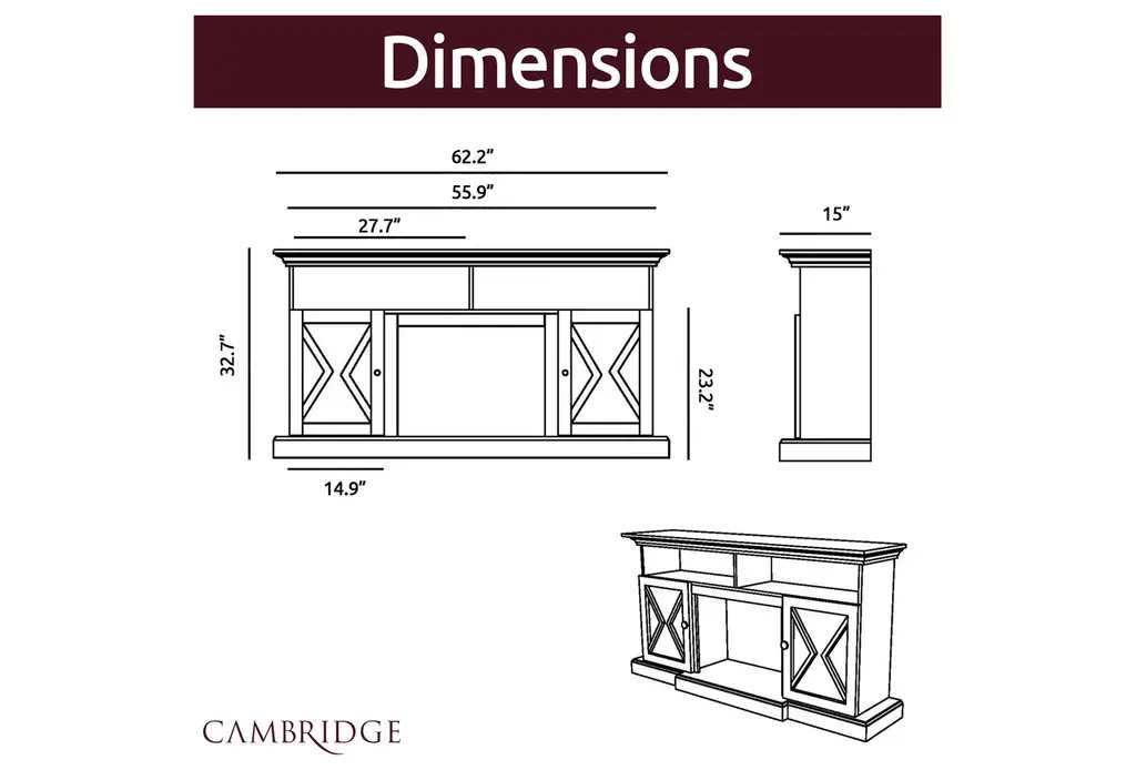 Incorporate a modern touch to your home with Cambridge's Summit farmhouse style electric fireplace mantel. This fireplace is paired with an enhanced, deep crystal insert to allow for your home to have the feel of a real fireplace without the hassle and maintenance of one. 5 color changing LED flame options allow you to enjoy a funky multicolor flame display that can be changed depending on your mood. The dual heat settings can also be adjusted accordingly for both warmth and energy saving purposes. The fireplace can be used with or without heat, so you are able to enjoy the ambience of your fireplace all year round. Cambridge's stylish farmhouse TV stand comes equipped with two barn door cabinets and shelving on top with hidden A/V cord holes that will accommodate up to a 60-inch television and will complement any household's decor. It includes a remote control for your convenience in adjusting the fireplace's settings from across the room.