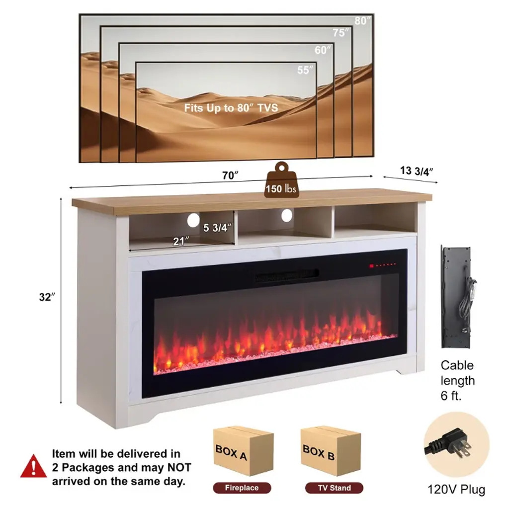 70-inch fireplace TV stand with 60-inch smart electric fireplace. Supports TVs up to 70 inches and offers app-enabled control of flame and heat.