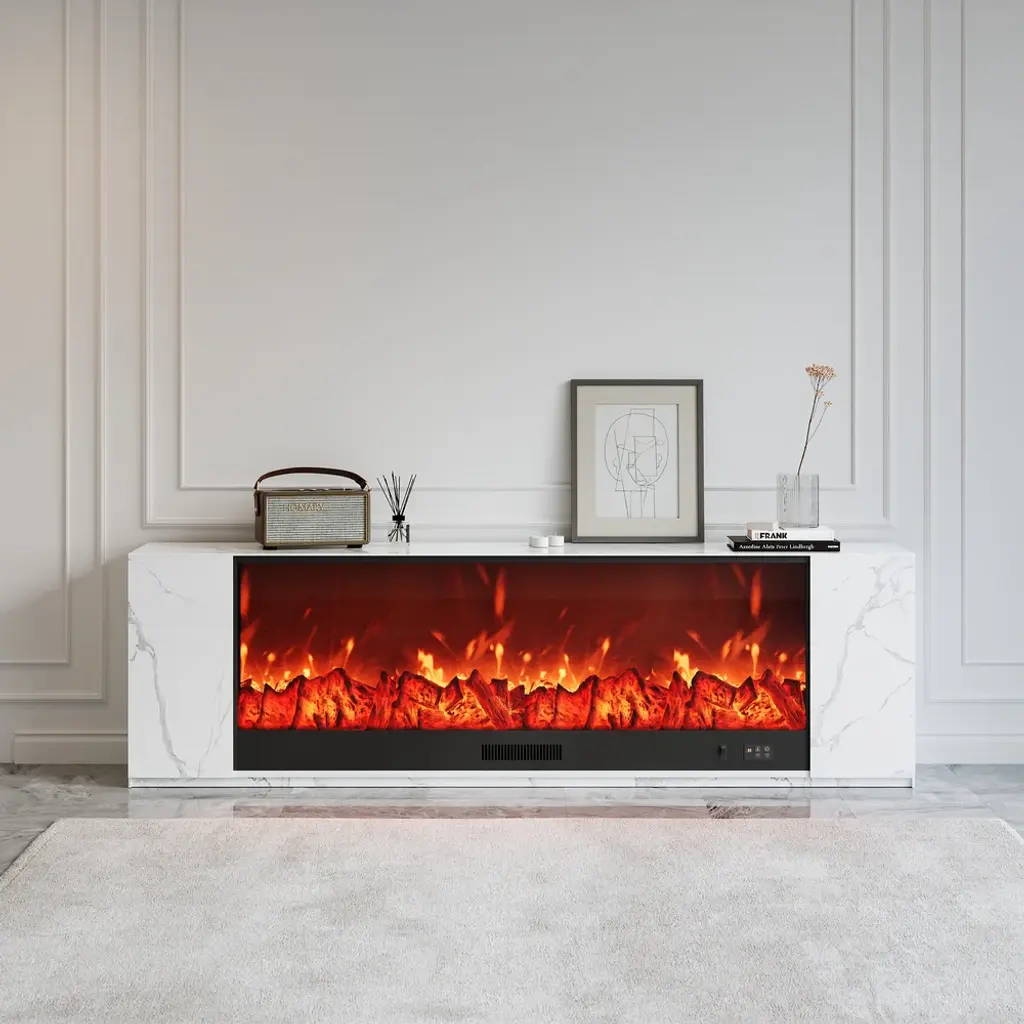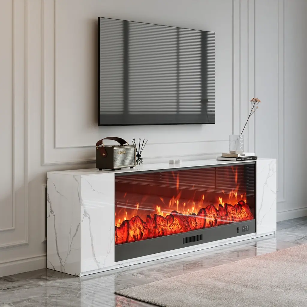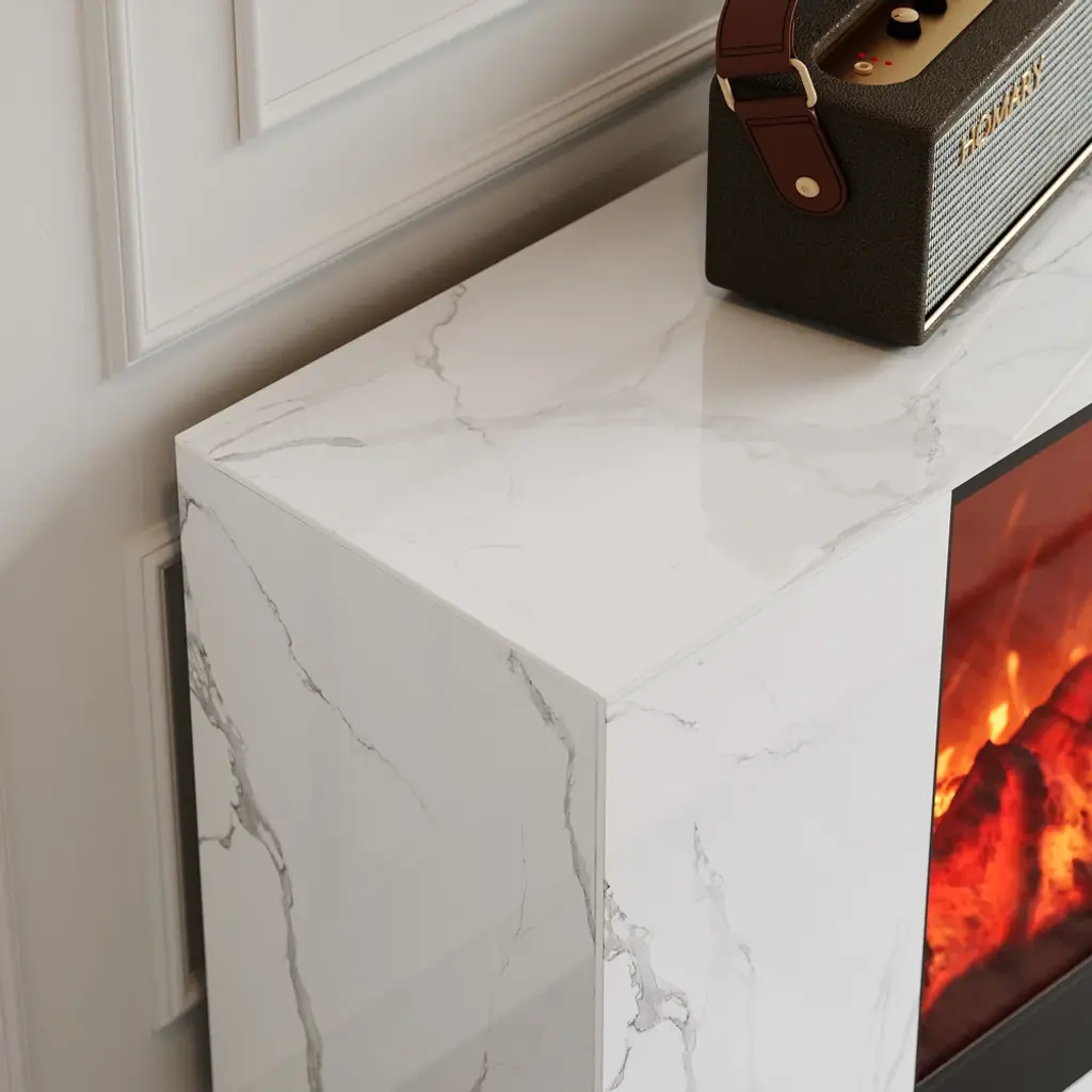 Elevate your living space with this exquisite marble-inspired stone coffee table. Featuring two drawers for discreet storage, it combines luxury and functionality. Its sleek, minimalist design and durable construction make it a perfect addition to modern interiors. This electric fireplace TV stand is elegant and energy-saving. Features 5 types of flame brightness, realistic 3D flame effects, glowing logs, and embers, which can heat the area to 400 square feet, the temperature can be adjusted. No firewood, no dust, no smoke, and no clean up, creating a clean and cozy relaxing space for you.