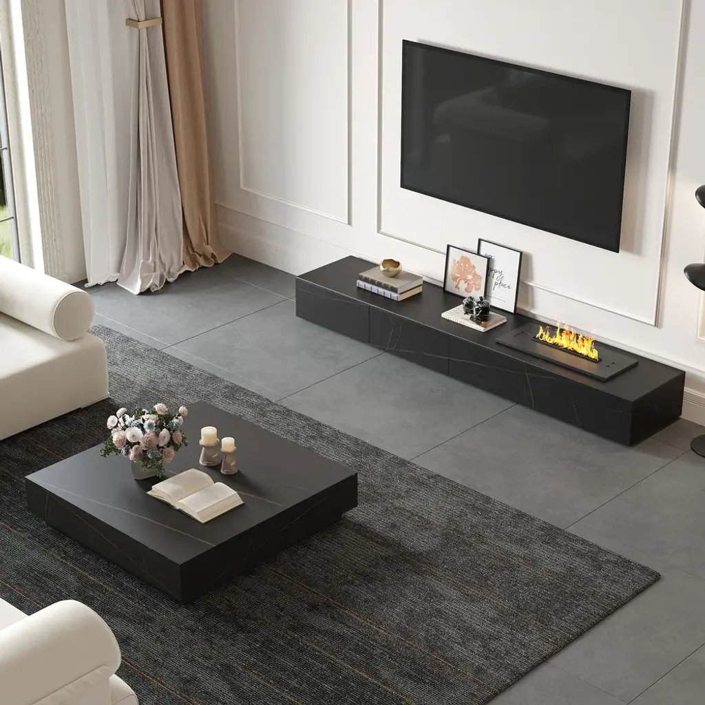 Elevate your living space with this exquisite marble-inspired stone coffee table. Featuring two drawers for discreet storage, it combines luxury and functionality. Its sleek, minimalist design and durable construction make it a perfect addition to modern interiors. This multifunctional TV stand combines a faux marble finish with a built-in fireplace and humidifier Featuring remote control operation, it offers warmth and comfort while the two drawers provide convenient storage A perfect addition to elevate both the style and functionality of your living room
