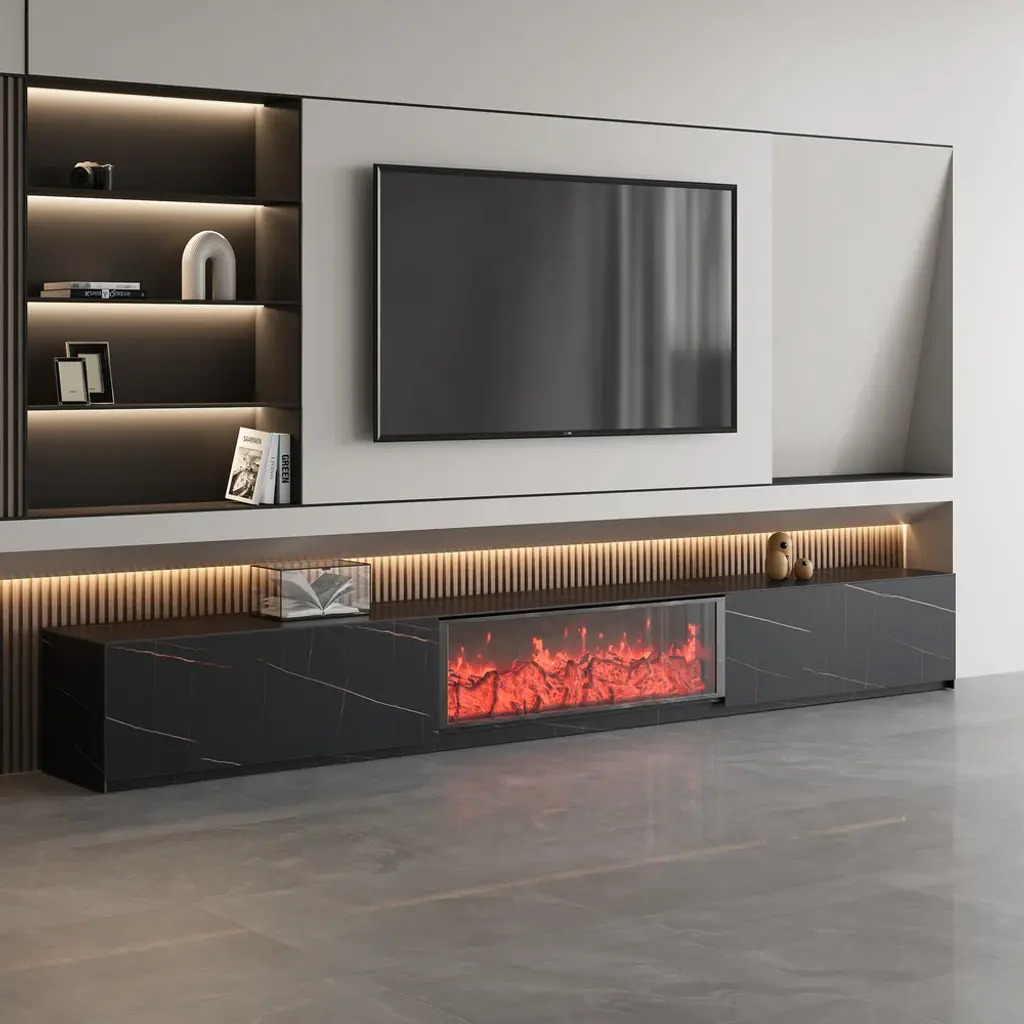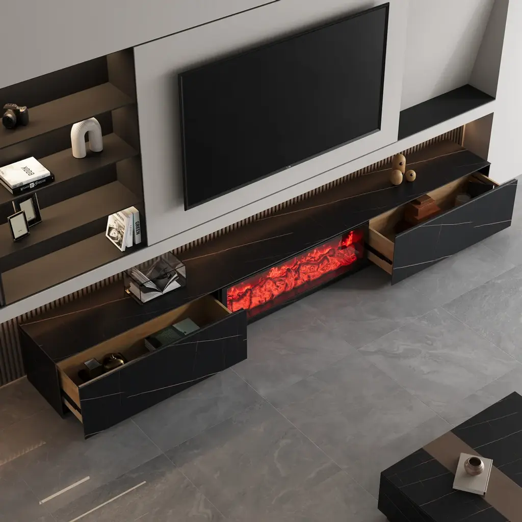 Elevate your living space with this exquisite marble-inspired stone coffee table. Featuring two drawers for discreet storage, it combines luxury and functionality. Its sleek, minimalist design and durable construction make it a perfect addition to modern interiors. This TV cabinet is made of high-quality marble veneer and marble veneer plates, which are durable and stylish. The electric fireplace has easy control, with the capacity to deliver far more realistic 3D flame effects, glowing logs, and embers to create coziness in the atmosphere. This comes with ample storage space, making it the best choice for decorating the living room and practicality.
