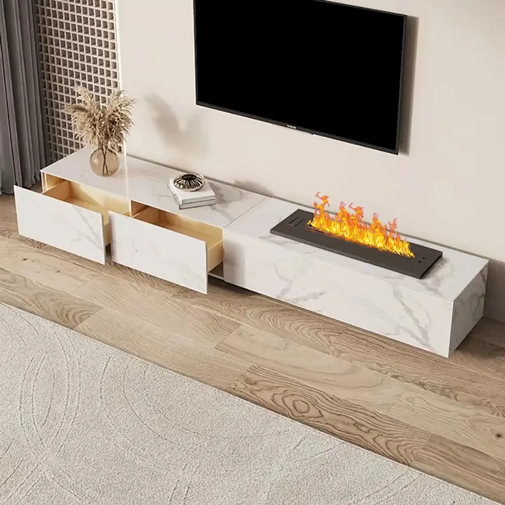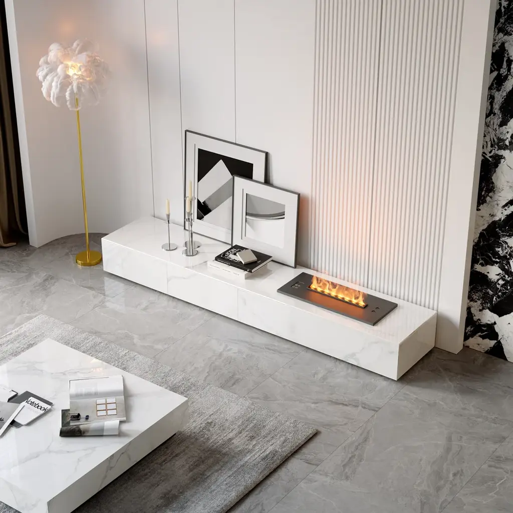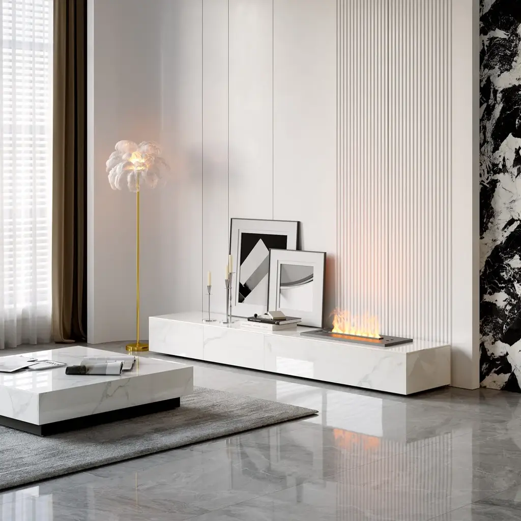 Elevate your living space with this exquisite marble-inspired stone coffee table. Featuring two drawers for discreet storage, it combines luxury and functionality. Its sleek, minimalist design and durable construction make it a perfect addition to modern interiors. This multifunctional TV stand combines a faux marble finish with a built-in fireplace and humidifier Featuring remote control operation, it offers warmth and comfort while the two drawers provide convenient storage A perfect addition to elevate both the style and functionality of your living room