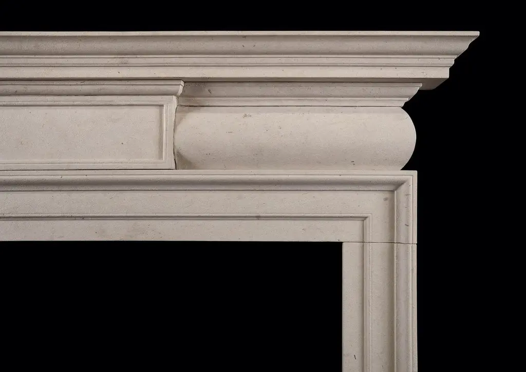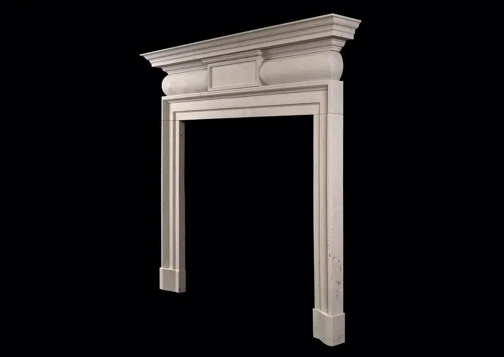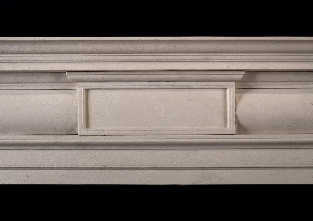 A good quality English Georgian style fireplace in Moleanos limestone. The barrel frieze with centre panel, surmounted by moulded shelf. A fine quality copy of a period piece. N.B. May be subject to an extended lead time, please enquire for more information.Shelf Width:1550 mm 61"Overall Height:1405 mm 55 ⅜"Opening Height:1010 mm 39 ¾"Opening Width:1085 mm 42 ¾"Depth Of Shelf:170 mm 6 ¾"Overall Plinths:1380 mm 54 ⅜"