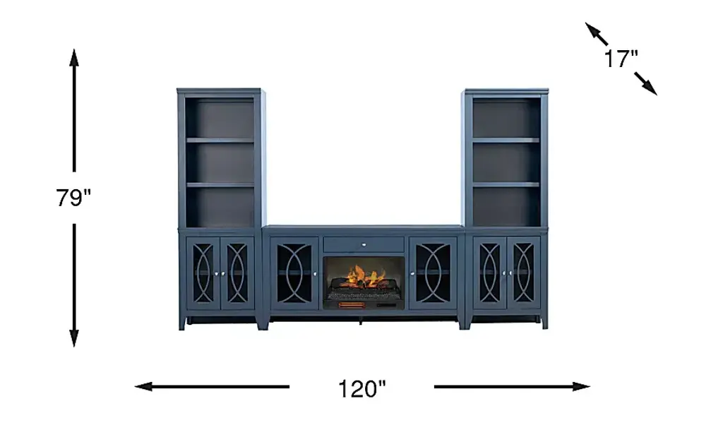 Bring sleek style and smart storage to your living room with the Abbie II wall unit. The console features a wide center drawer for essentials and glass-front cabinets with geometric overlays that neatly conceal electronics, decor and more. At its center, an electric log fireplace provides both warmth and ambiance, showcasing 3D flame effects that can be adjusted with a convenient remote. A built-in timer allows settings from 30 minutes to 60 hours, while the adjustable thermostat ranges from 62 to 82 degrees for personalized comfort. Flanking piers echo the design of the console, each offering three open shelves above a closed cabinet base, creating space for both display and storage. A gorgeous blue finish brightens the entire set, while brushed silver hardware adds a refined final touch.