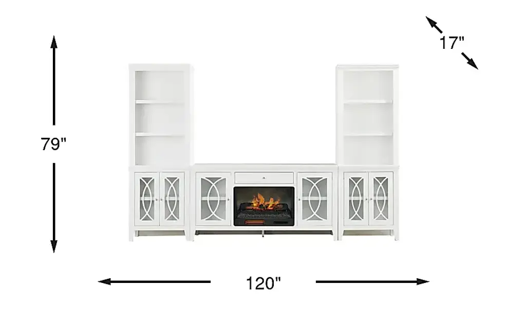 Bring sleek style and smart storage to your living room with the Abbie II wall unit. The console features a wide center drawer for essentials and glass-front cabinets with geometric overlays that neatly conceal electronics, decor and more. At its center, an electric log fireplace provides both warmth and ambiance, showcasing 3D flame effects that can be adjusted with a convenient remote. A built-in timer allows settings from 30 minutes to 60 hours, while the adjustable thermostat ranges from 62 to 82 degrees for personalized comfort. Flanking piers echo the design of the console, each offering three open shelves above a closed cabinet base, creating space for both display and storage. A gorgeous white finish brightens the entire set, while brushed silver hardware adds a refined final touch.