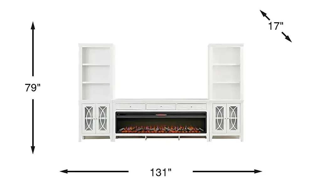 Bring sleek style and smart storage to your living room with the Abbie II wall unit. The console includes three spacious drawers along the top for essentials. At its center, an electric log fireplace provides both warmth and ambiance, showcasing 3D flame effects that can be adjusted with a convenient remote. A built-in timer allows settings from 30 minutes to 60 hours, while the adjustable thermostat ranges from 62 to 82 degrees for personalized comfort. Flanking piers echo the design of the console, each with three open shelves above a closed cabinet base that has glass-front doors featuring geometric overlay detailing that helps conceal essentials with ease. A gorgeous white finish brightens the entire set, while brushed silver hardware adds a refined final touch.