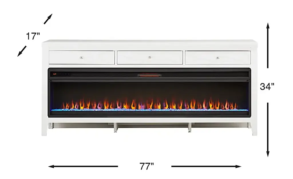 Bring sleek style and smart storage to your living room with the Abbie II console. Featuring a gorgeous white finish, this console includes three spacious drawers along the top for essentials. At its center, an energy-saving LED firebox adds both warmth and ambiance, complete with remote-controlled heat and ambient lighting with four color-changing options to create a cozy atmosphere. Brushed silver hardware provides the final touch of contemporary elegance, making this console as functional as it is stylish.