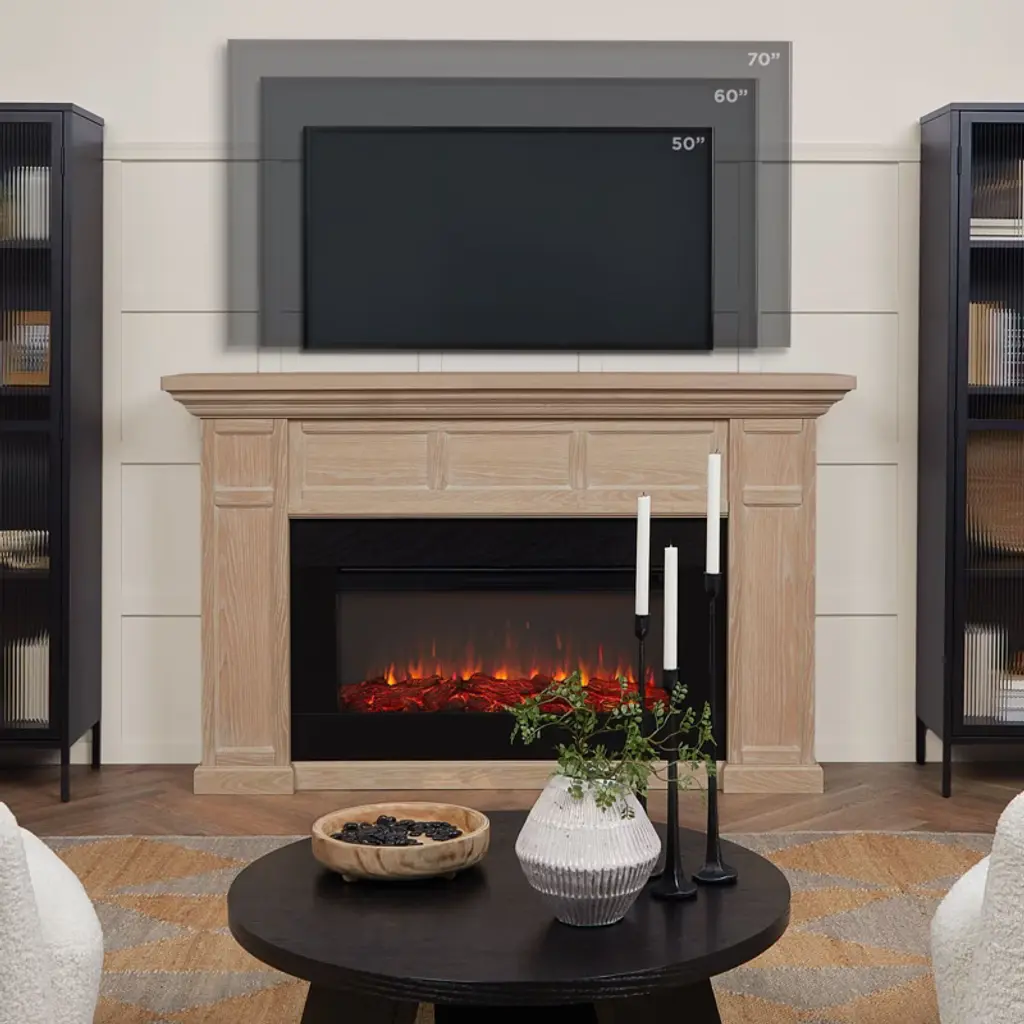 Create a welcoming, cheerful home with the fresh, modern farmhouse style of the Alcott landscape electric fireplace. Part of the Real Flame® VividFlame™ Landscape Series, this widescreen electric firebox mimics the look of a real, flickering fire, but does not require a chimney or vents and conveniently plugs into a standard outlet. This free-standing, extra-long indoor fireplace has a mantel with a real wood finish and features six flame colors, five flame brightness levels, adjustable thermostat, timer function and automatic safety shut-off. The electric fireplace insert provides supplemental heat for rooms up to 1,000 sq ft or the heater can be turned off so you can enjoy the comforting ambiance of a glowing fireplace year-round. Mantel, firebox with log set, hardware and remote control are included.