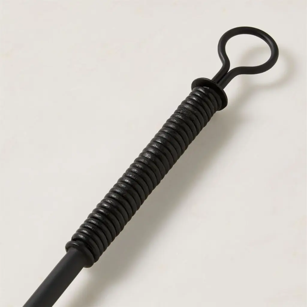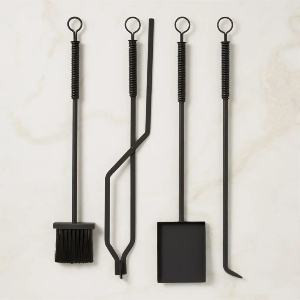 A heat-resistant matte black finish gives this iron fireplace tool set by Barcelona-based Mermelada Estudio a modern update. Hand-wrapped leather cording on the stand is continued down the looped handles to create a cohesive look. CB2 exclusive.