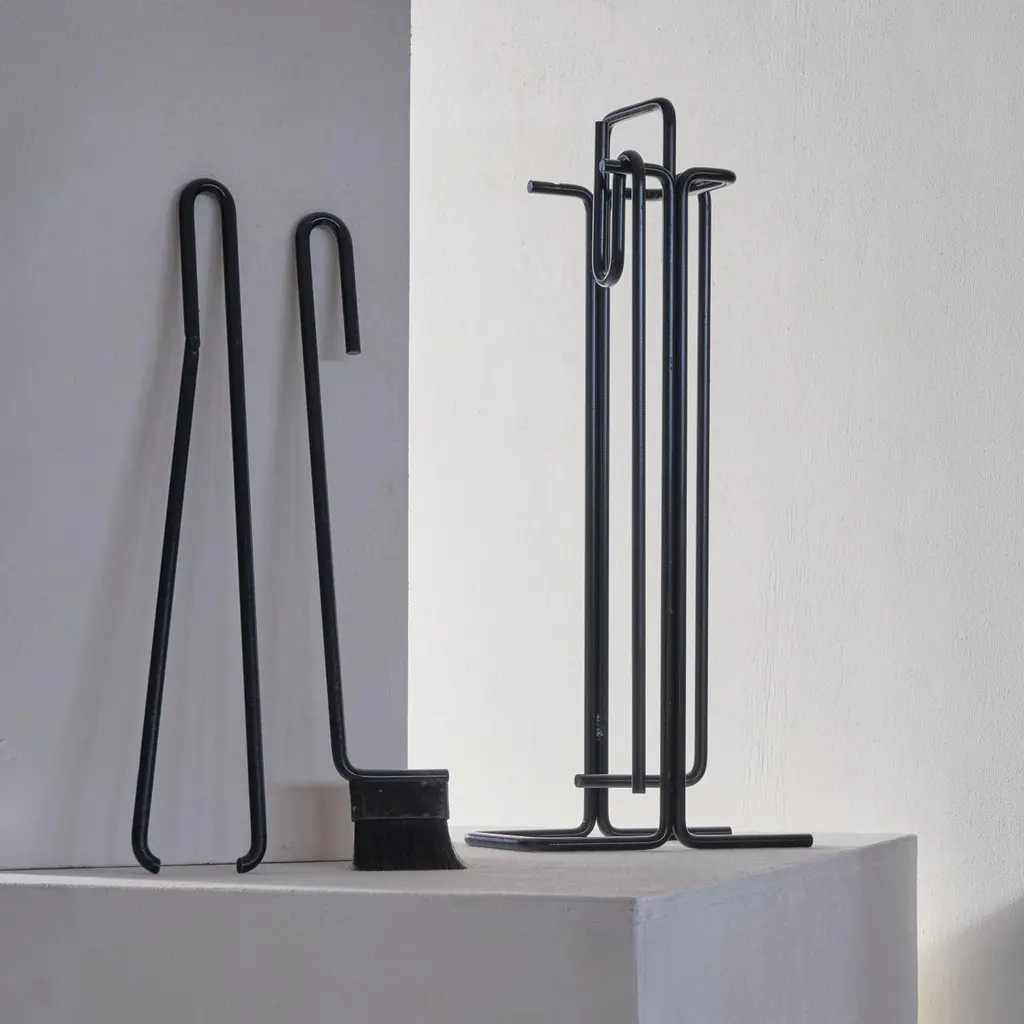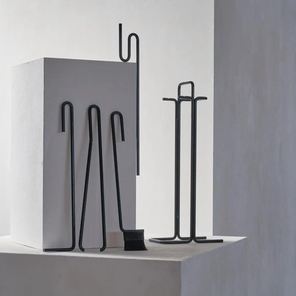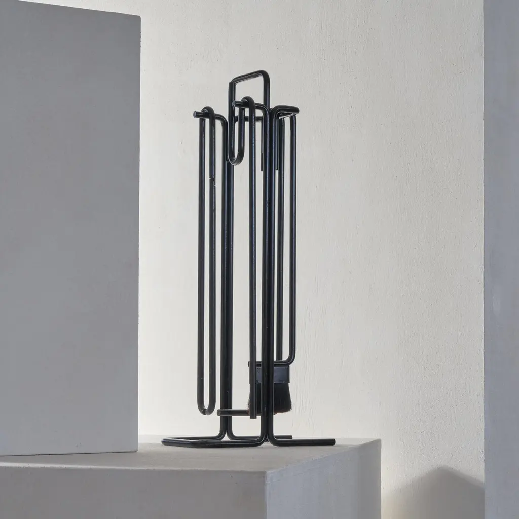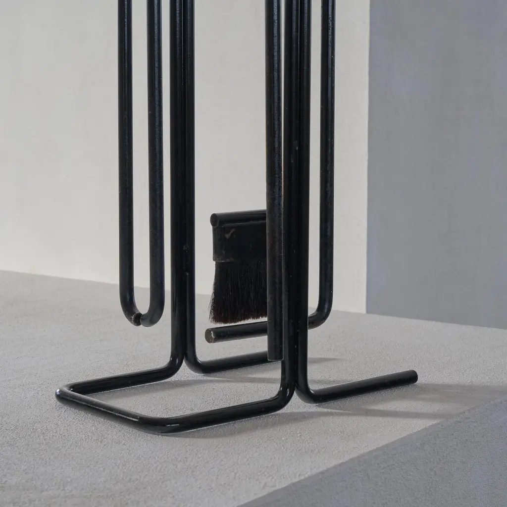 A stunning modernist fireplace set by Ann Maes for Mace-Line, 1977, The Netherlands.This fireplace set is a real design classic. Few memorable fireplace sets have been made, but this one by Ann Maes is definitely one of them. A very stylish and distinct design that is simple in line, yet immensely complex at the same time. A design by Ann Maes for her own company Mace-Line. Beautifully simple yet complex minimalist shapes. A real statement piece for next to the fireplace. Suits many interior styles due to the understated but rich appearance of the set. Cast and wrought iron. The fireplace set consists of a stand, a broom, blow pipe, a poker and tongs.Good vintage condition with signs of use. Please note we have several sets available with similar wear and condition. Also, please note that we also have a stunning magazine rack by Ann Maes in our collection.