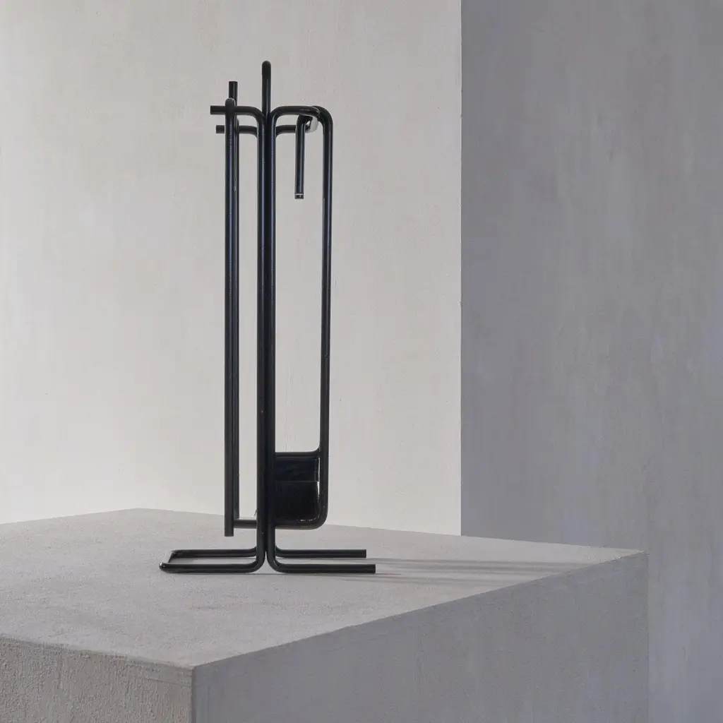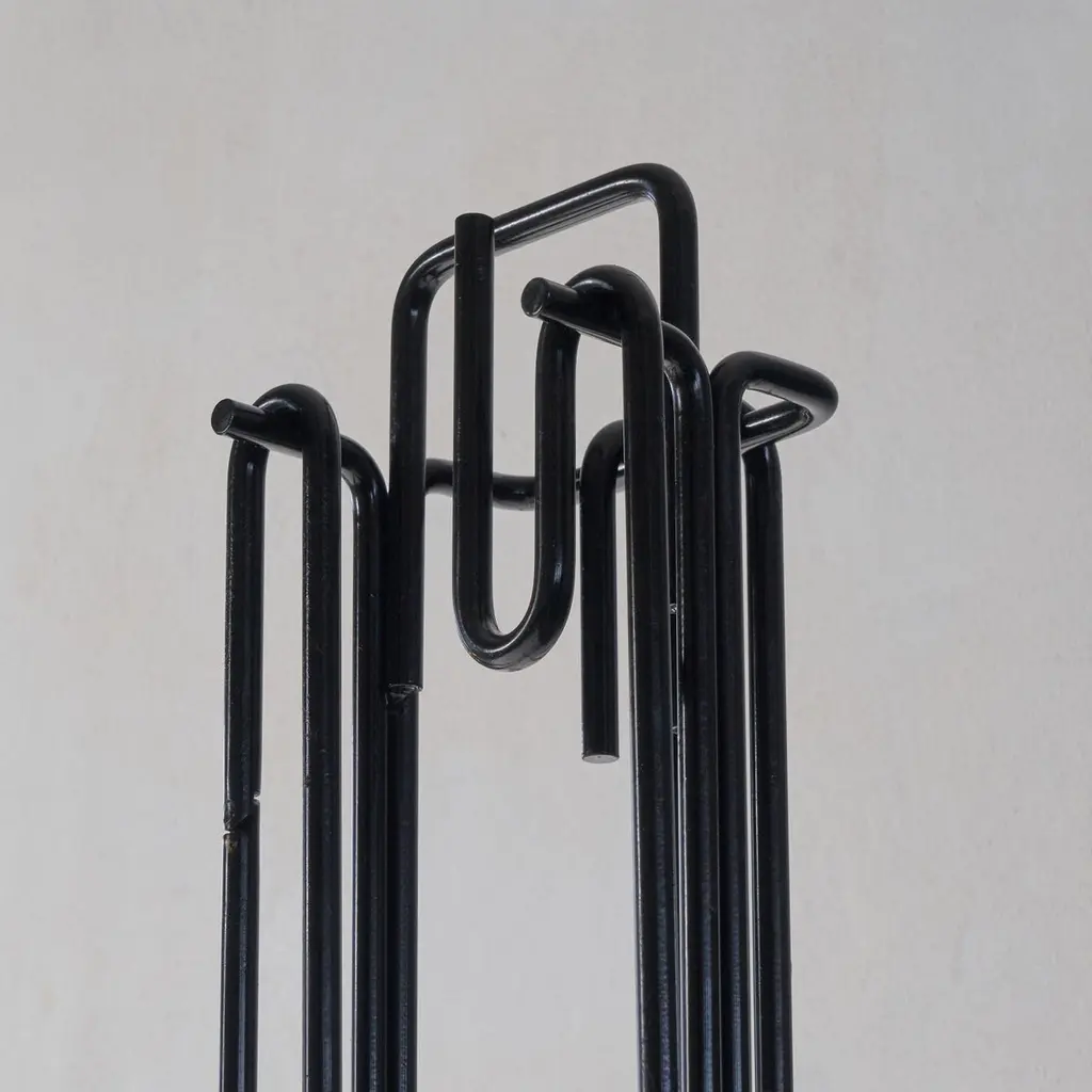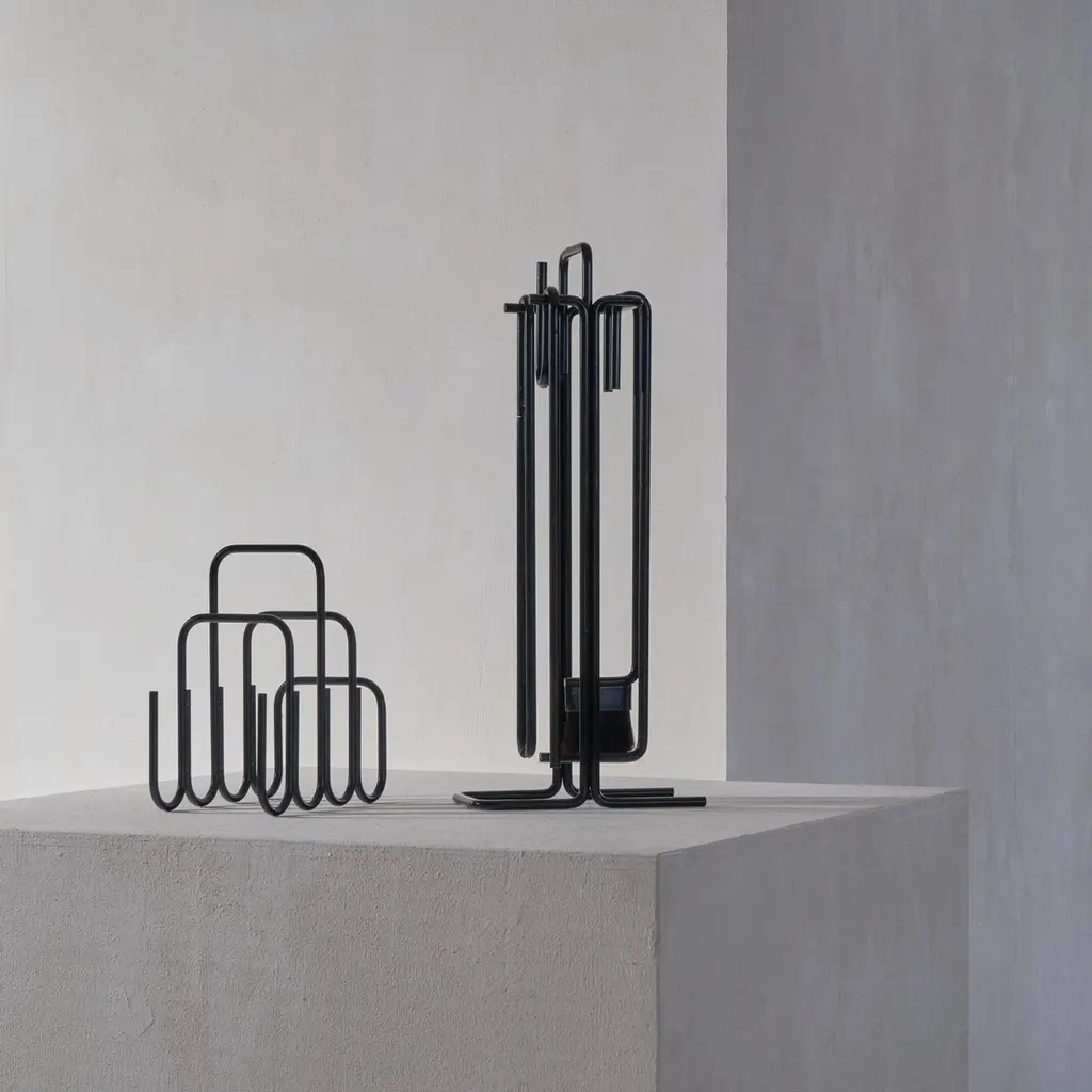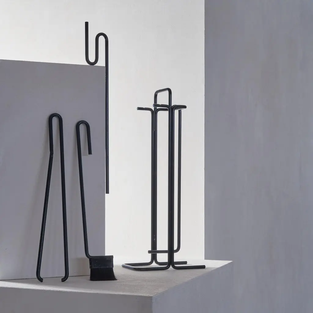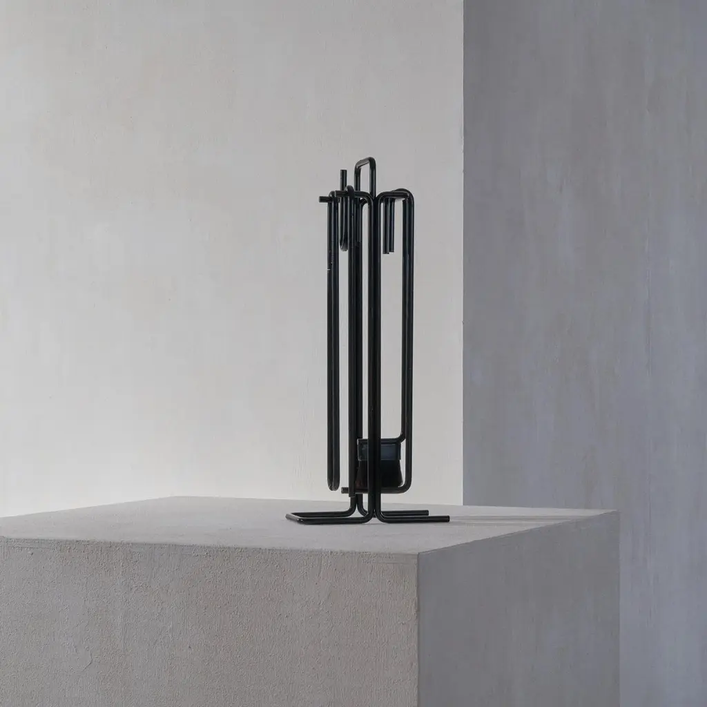 A stunning modernist fireplace set by Ann Maes for Mace-Line, 1977, The Netherlands.This fireplace set is a real design classic. Few memorable fireplace sets have been made, but this one by Ann Maes is definitely one of them. A very stylish and distinct design that is simple in line, yet immensely complex at the same time. A design by Ann Maes for her own company Mace-Line. Beautifully simple yet complex minimalist shapes. A real statement piece for next to the fireplace. Suits many interior styles due to the understated but rich appearance of the set. Cast and wrought iron. The fireplace set consists of a stand, a broom, blow pipe, a poker and tongs.Good vintage condition with signs of use. Please note we have several sets available with similar wear and condition. Also, please note that we also have a stunning magazine rack by Ann Maes in our collection.