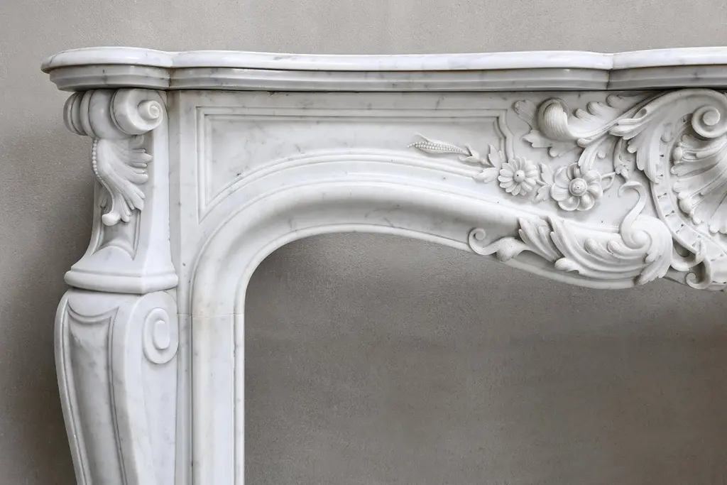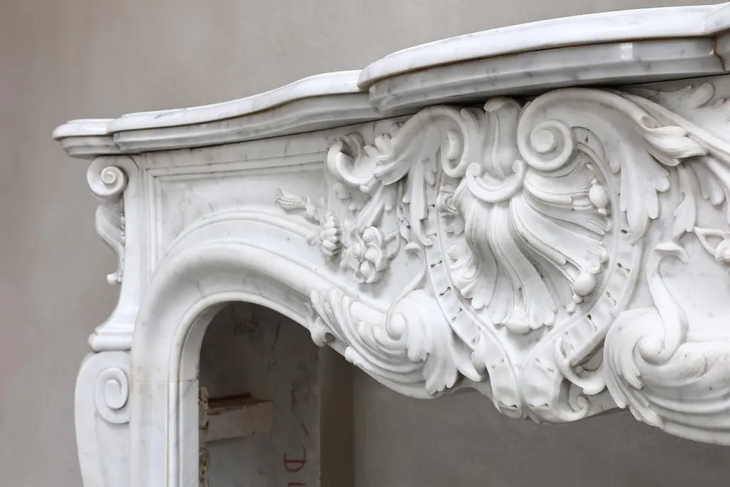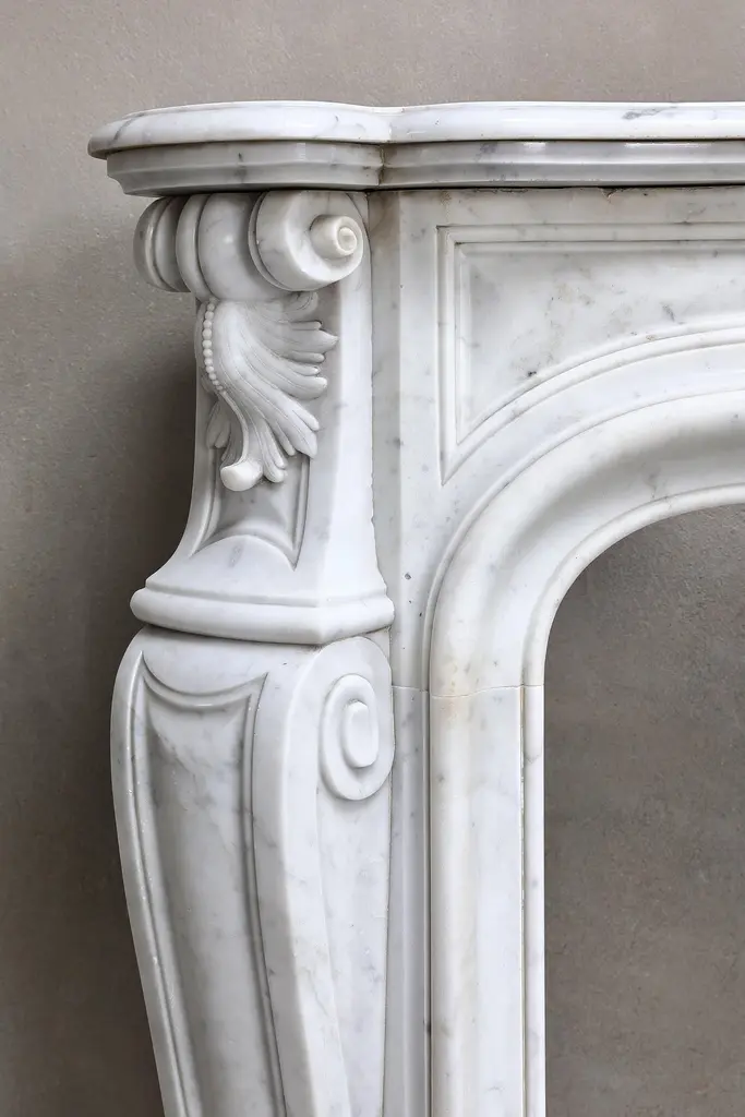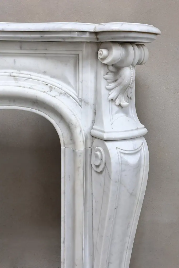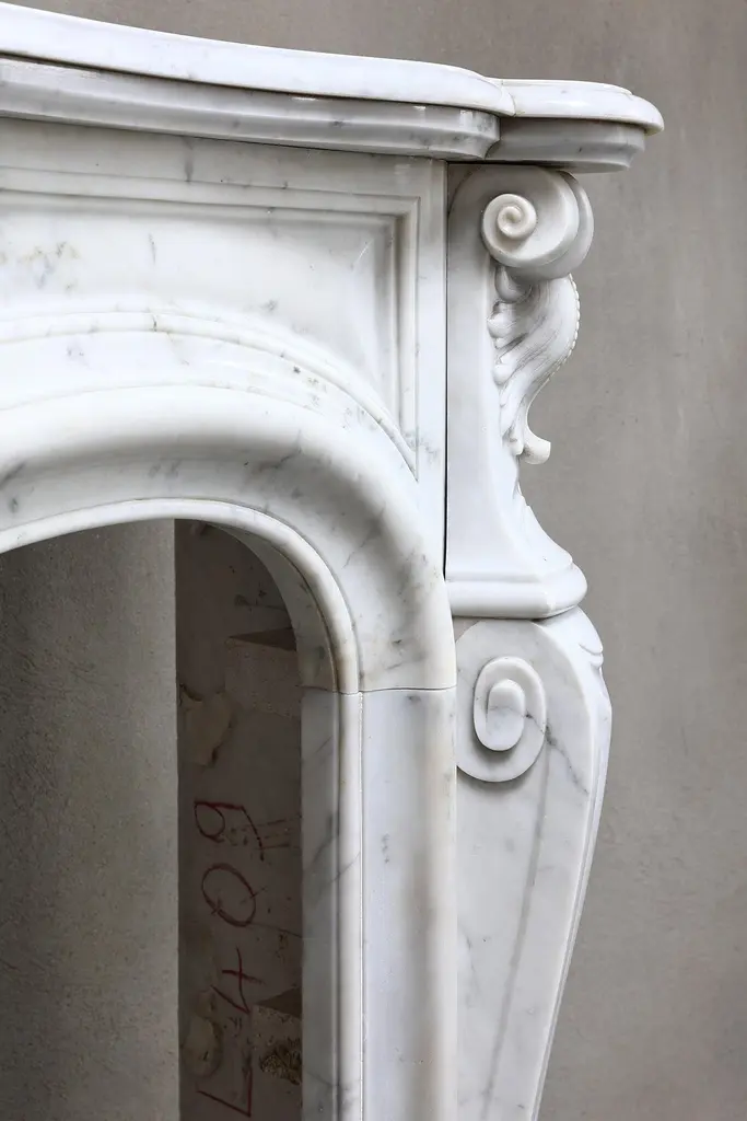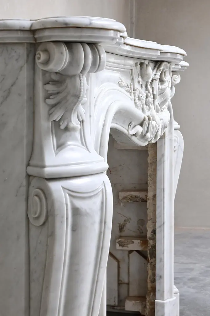 Beautiful exclusive antique fireplace made of Carrara marble from Italy! This 19th century fireplace is in the style of Louis XV and richly decorated with various ornaments in the front part and on the legs. A chic fireplace within our collection.