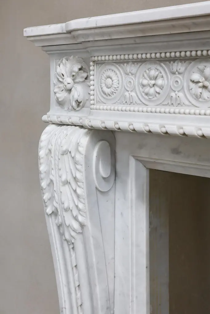 Very exclusive mantel of Carrara marble from Italy! A beautifully decorated fireplace in the style of Louis XVI with various ornaments in the front part of the fireplace and on the legs! This fireplace from the 19th century is chic and has an elegant appearance!