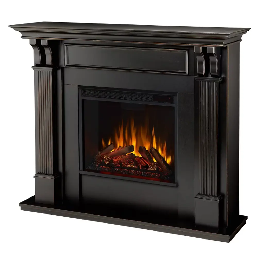 Beautifully carved pilasters topped with curved corbels give the Ashley electric fireplace a casual elegance that will light up your home. The Real Flame® VividFlame™ electric firebox mimics the look of a real, flickering fire, but does not require a chimney or vents and conveniently plugs into a standard outlet. This free-standing indoor fireplace has a mantel with a real wood finish and features six flame colors, five flame brightness levels, adjustable thermostat, timer function and automatic safety shut-off. The electric fireplace insert provides supplemental heat for rooms up to 1,000 sq ft or the heater can be turned off so you can enjoy the comforting ambiance of a glowing fireplace year-round. Mantel, firebox with log set, hardware and remote control are included.