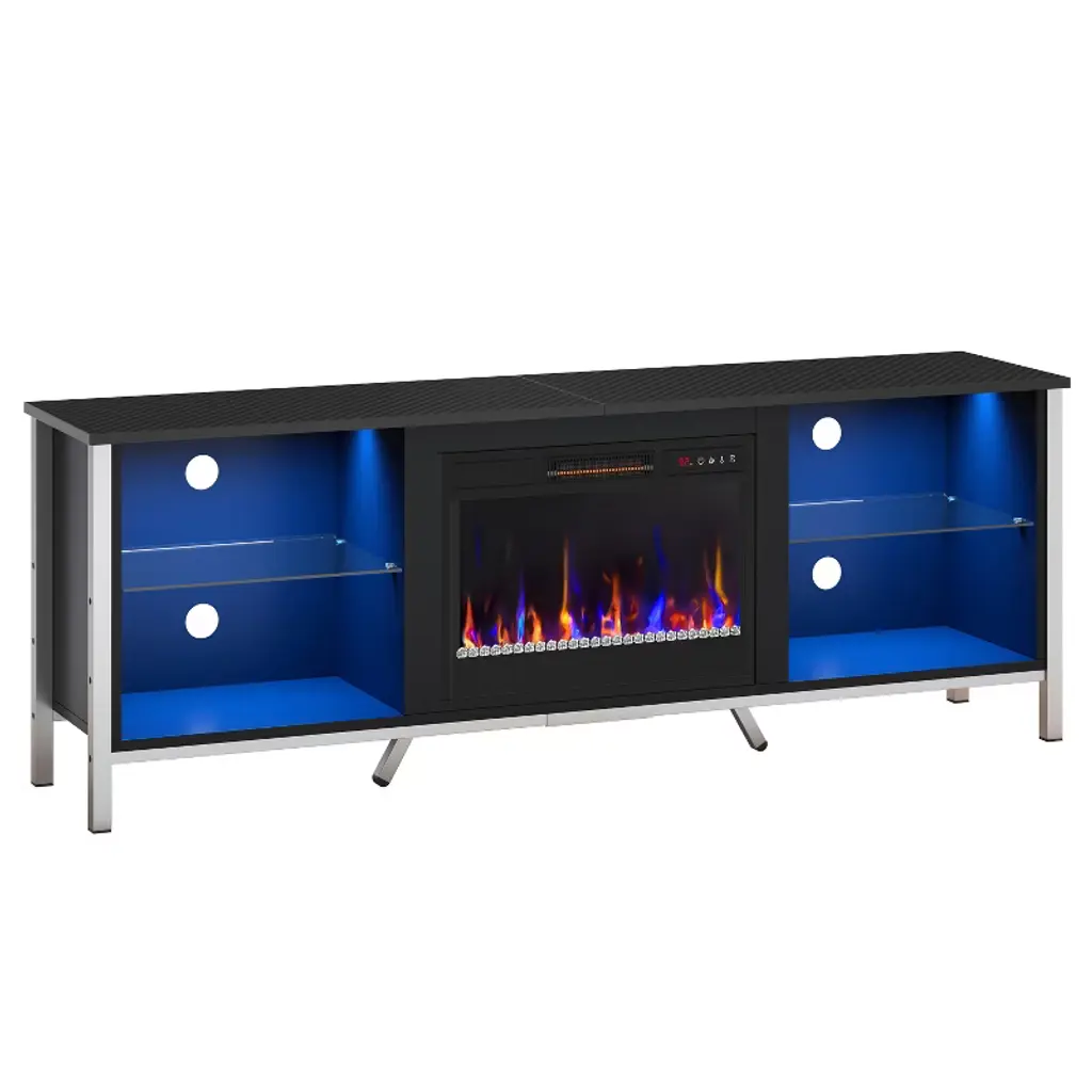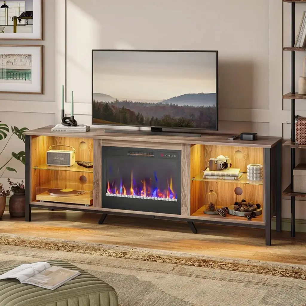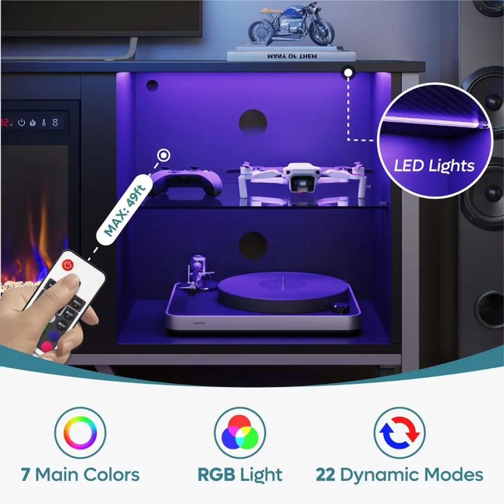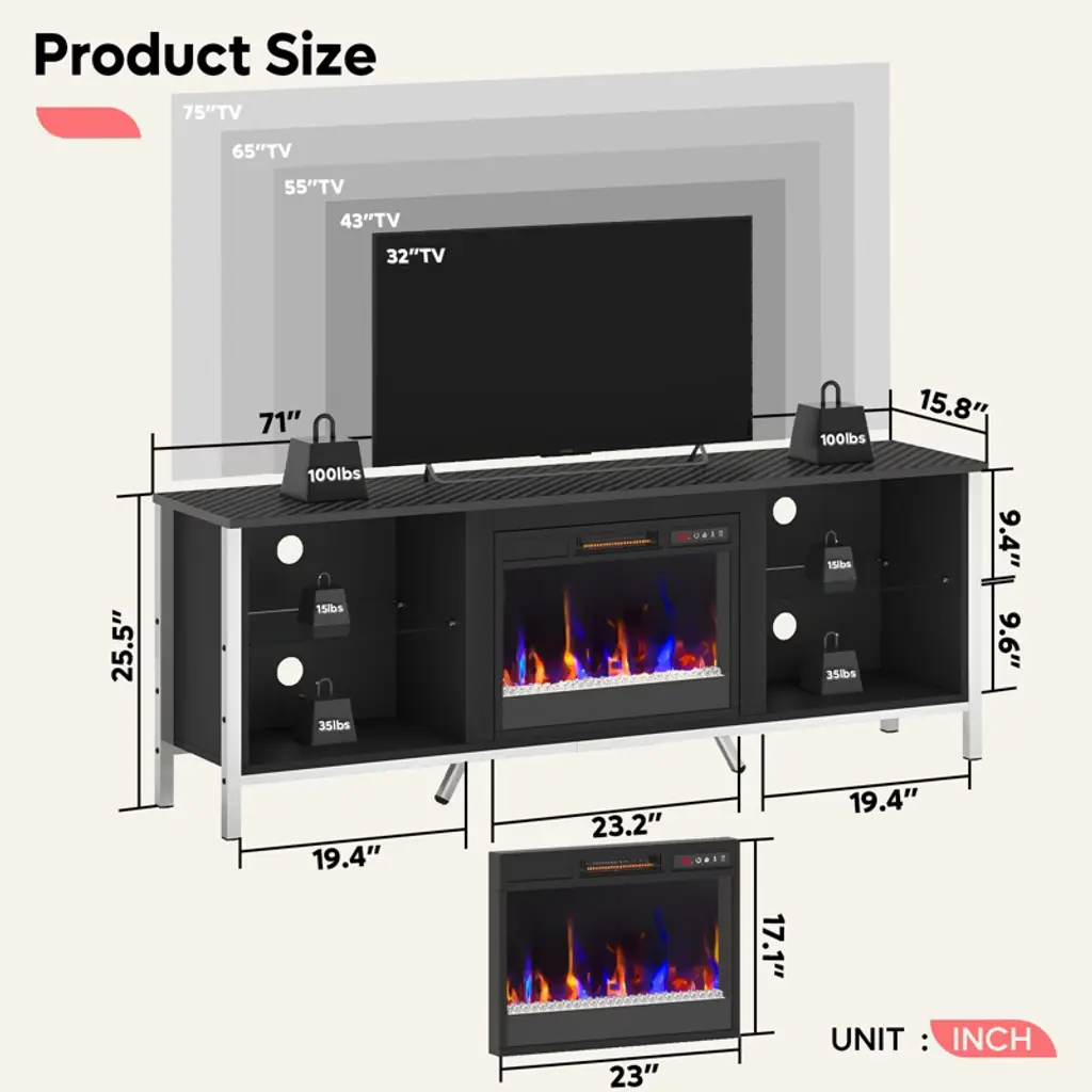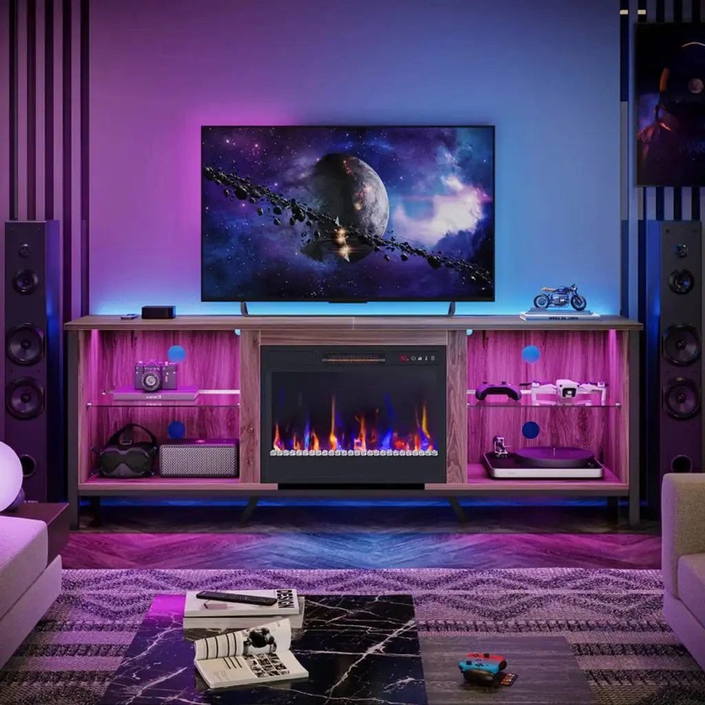 This fireplace tv stand combines functionality and style, perfectly fitting TVs up to 75 in. and adding a touch of fashion and elegance to your home. The fireplace features 7-changeable flame colors and 5 levels dimmer, set with temperature controller and timer to maintain air humidity. With a 17-key remote control and RGB LED technology, you can easily adjust the lighting to create a colorful and vibrant atmosphere in your entertainment space. Bring this Entertainment Center into your home and create a functional and safety entertainment area.